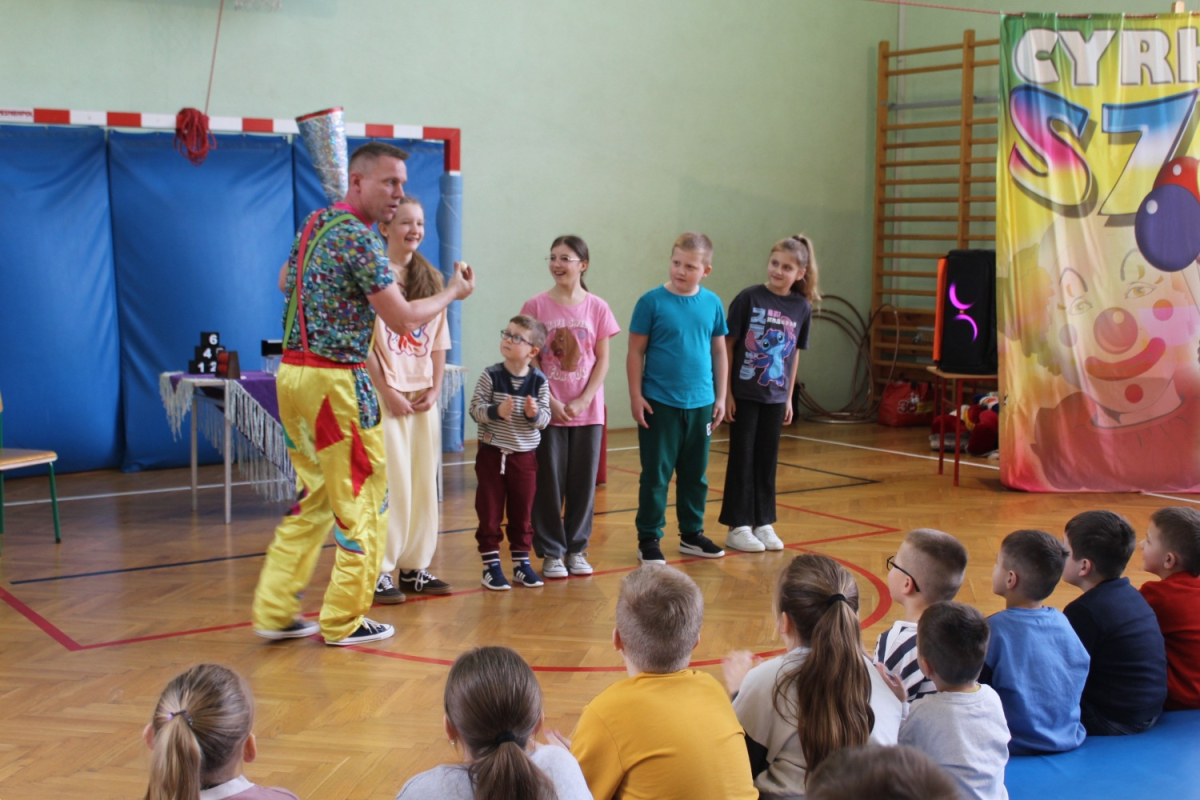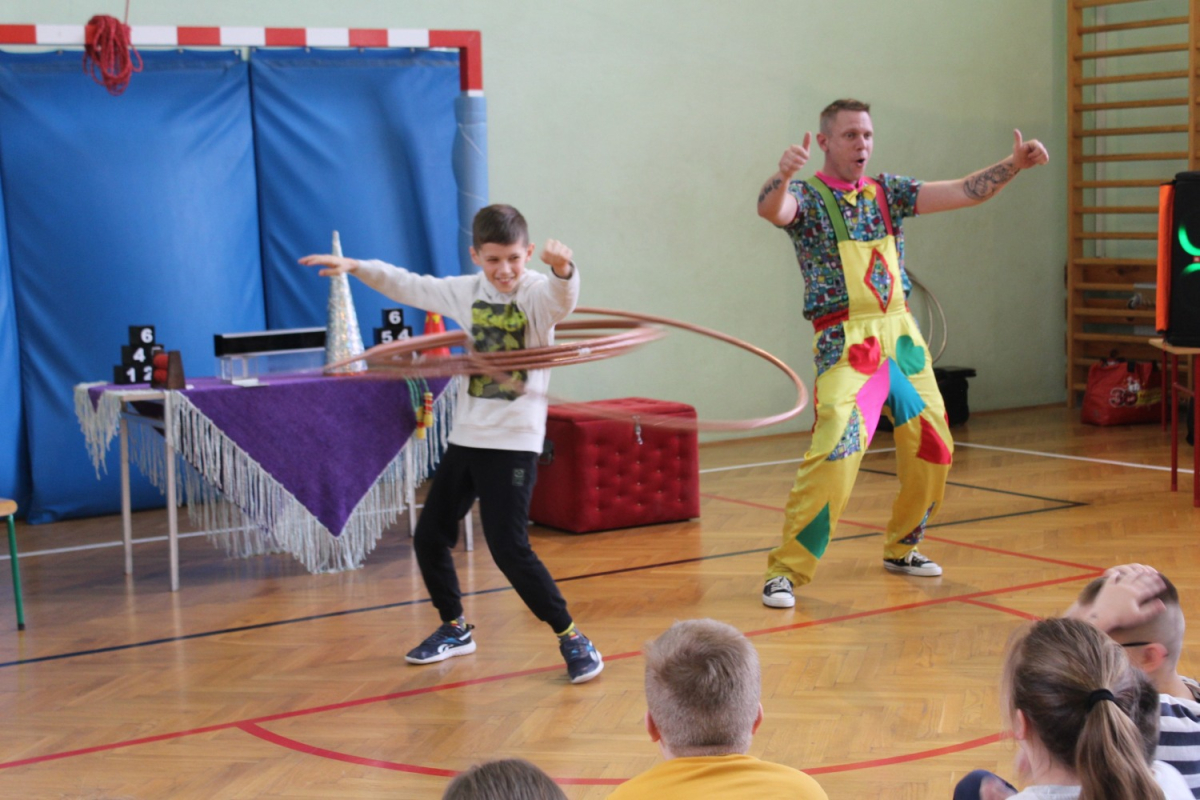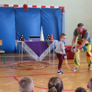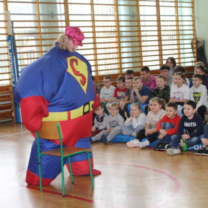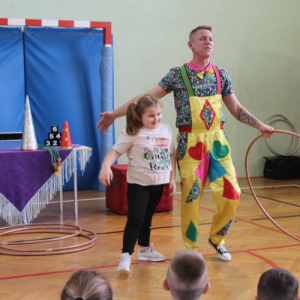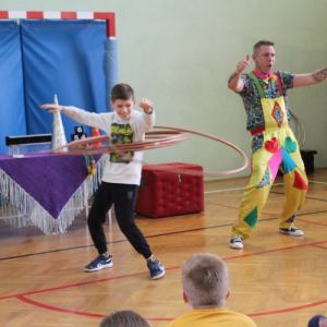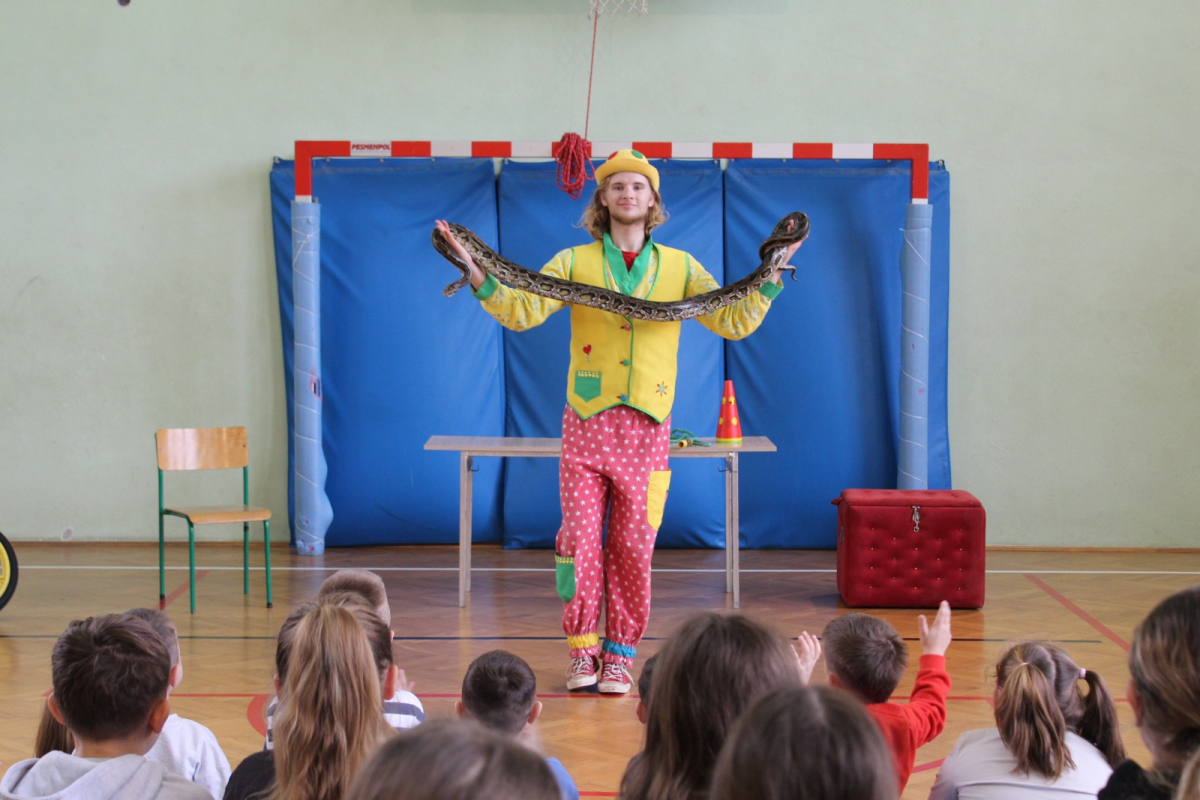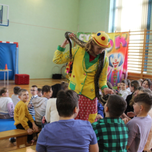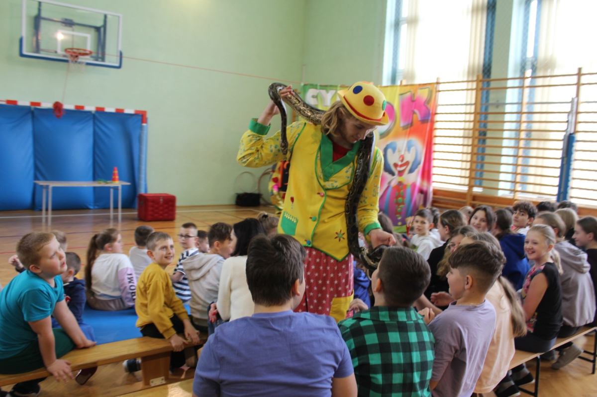 5.02.2026 roku do naszej szkoły zawitali niecodzienni goście – Cyrk „Szok”. Uczniowie wraz ze swoimi opiekunami obejrzeli ciekawy i jednocześnie zabawny program artystyczny. Wystąpili: superman, wesoły klaun oraz biały miś”. Chętne i odważne dzieci nie tylko miały okazję podziwiać sztuczki cyrkowe, ale także brać w nich czynny udział. Dzieci z entuzjazmem próbowały wykonać cyrkowe akrobacje, co wzbudzało radość wszystkich widzów. Największe emocje wzbudził duży wąż boa dusiciel! I nie brakło śmiałków, którzy go dotykali i nawet trzymali na ramionach. :)