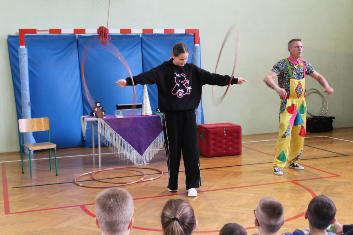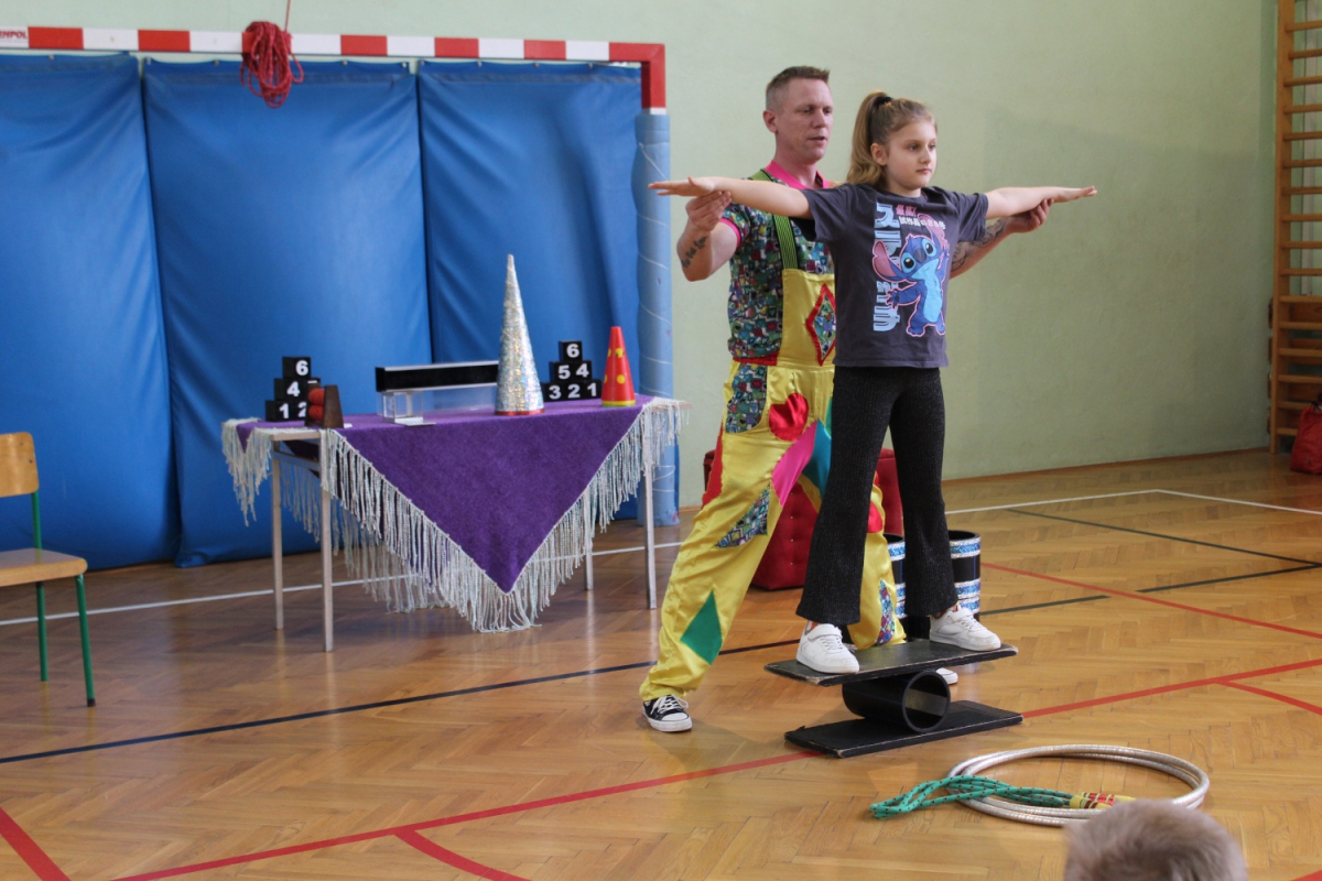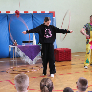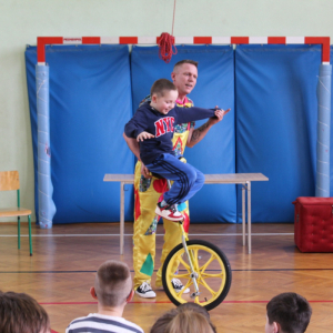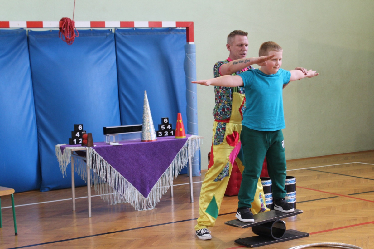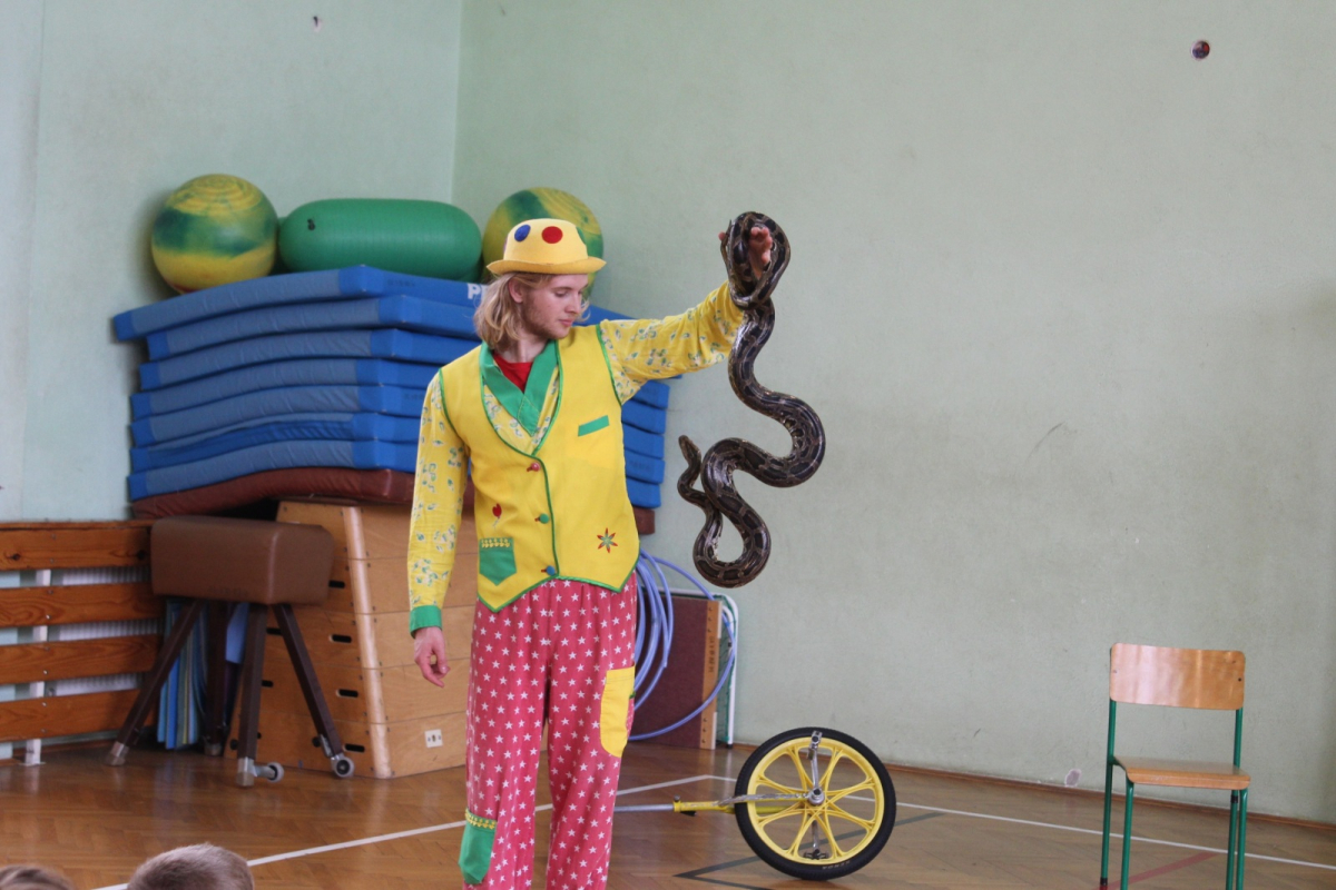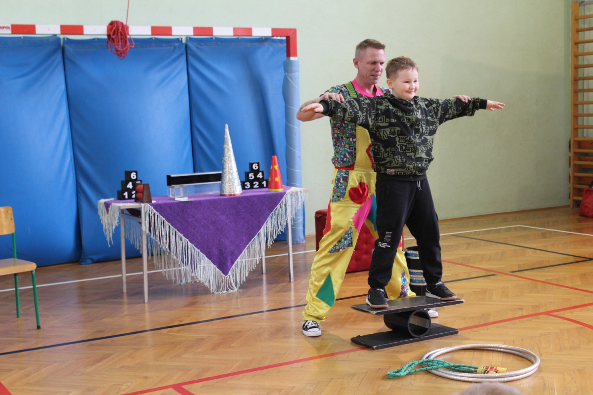 5.02.2026 roku do naszej szkoły zawitali niecodzienni goście – Cyrk „Szok”. Uczniowie wraz ze swoimi opiekunami obejrzeli ciekawy i jednocześnie zabawny program artystyczny. Wystąpili: superman, wesoły klaun oraz biały miś”. Chętne i odważne dzieci nie tylko miały okazję podziwiać sztuczki cyrkowe, ale także brać w nich czynny udział. Dzieci z entuzjazmem próbowały wykonać cyrkowe akrobacje, co wzbudzało radość wszystkich widzów. Największe emocje wzbudził duży wąż boa dusiciel! I nie brakło śmiałków, którzy go dotykali i nawet trzymali na ramionach. :)