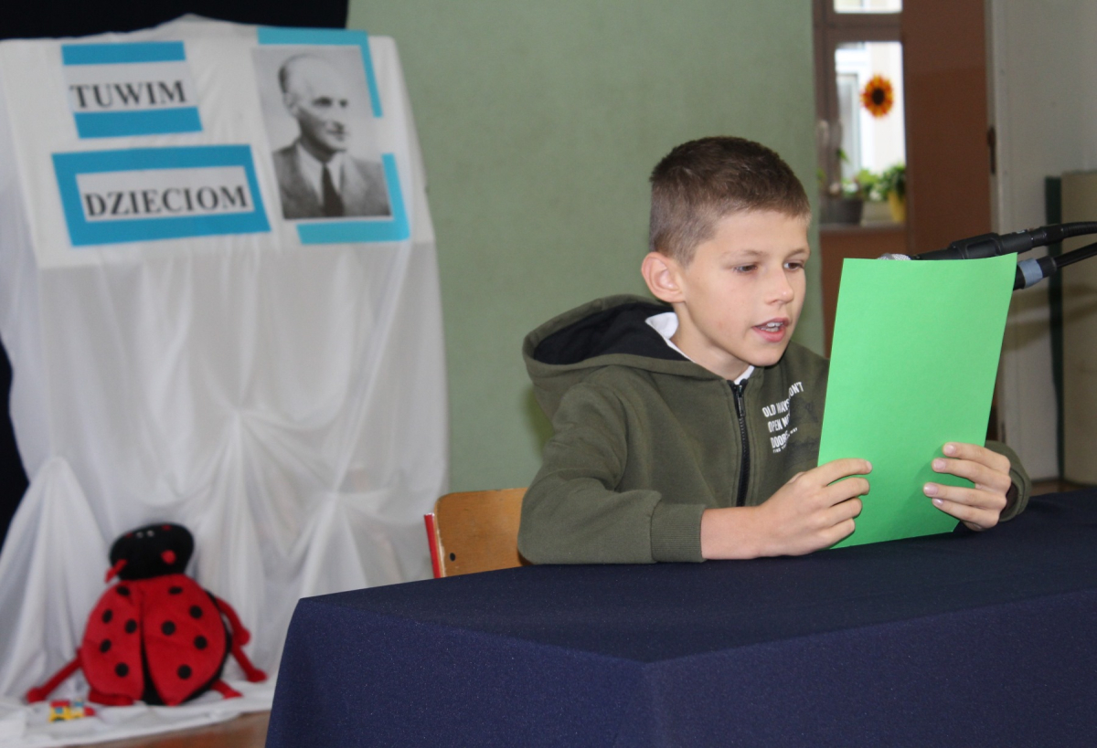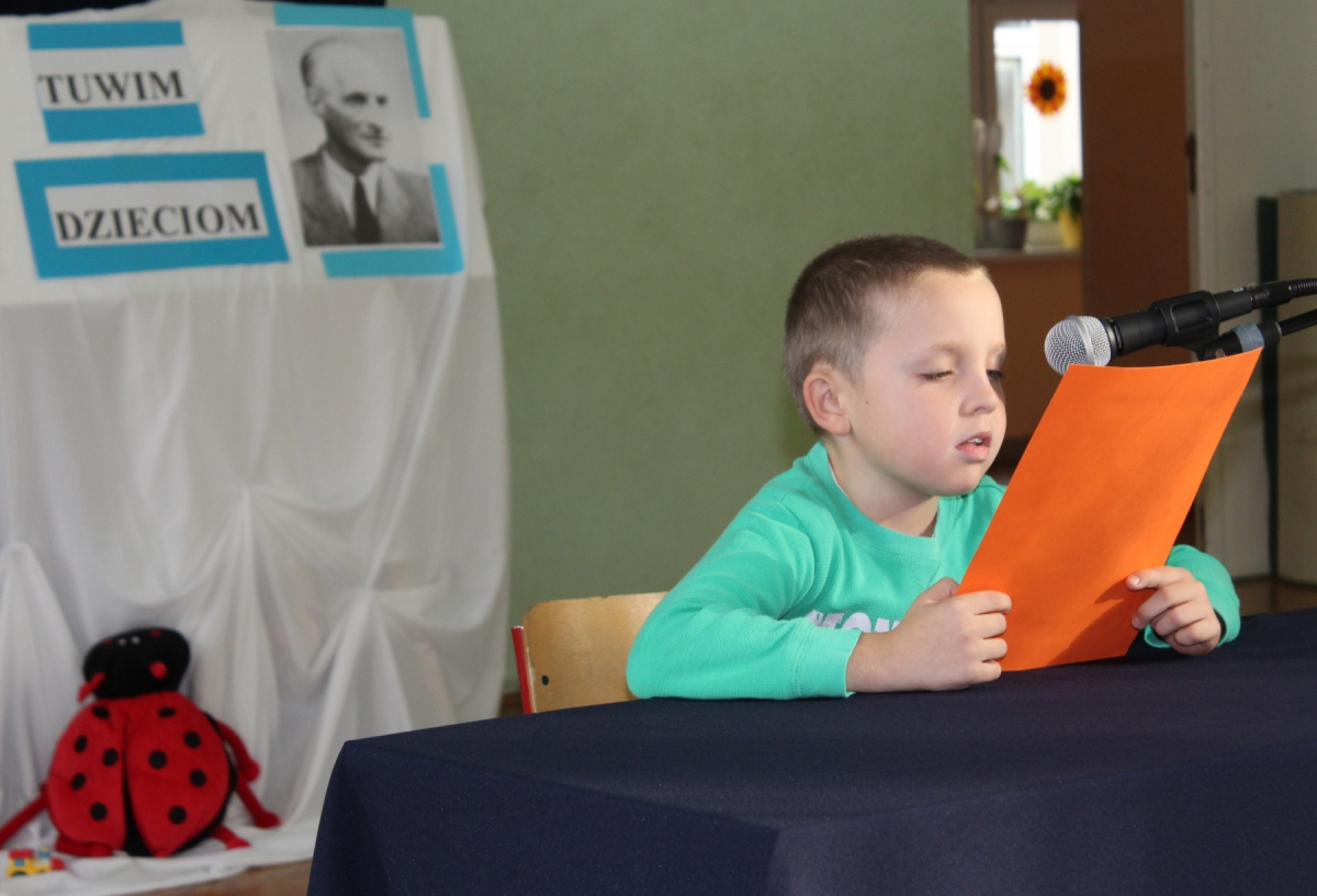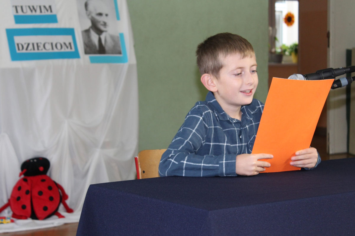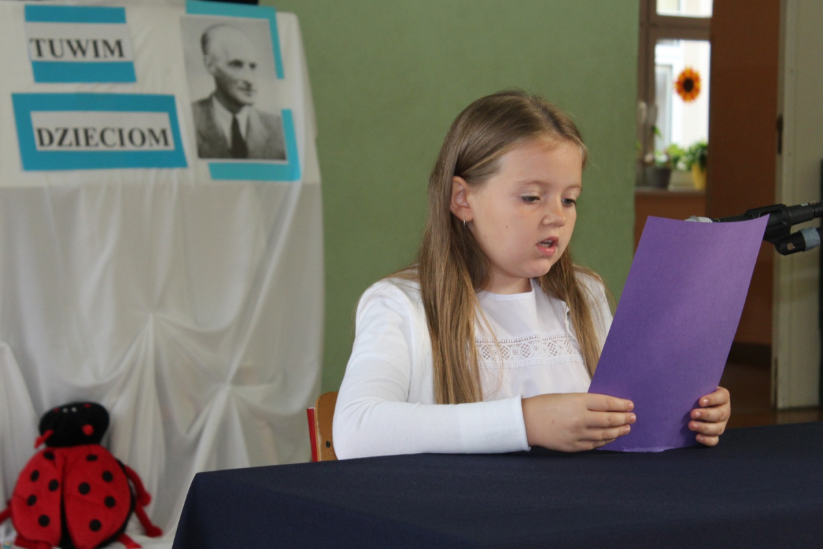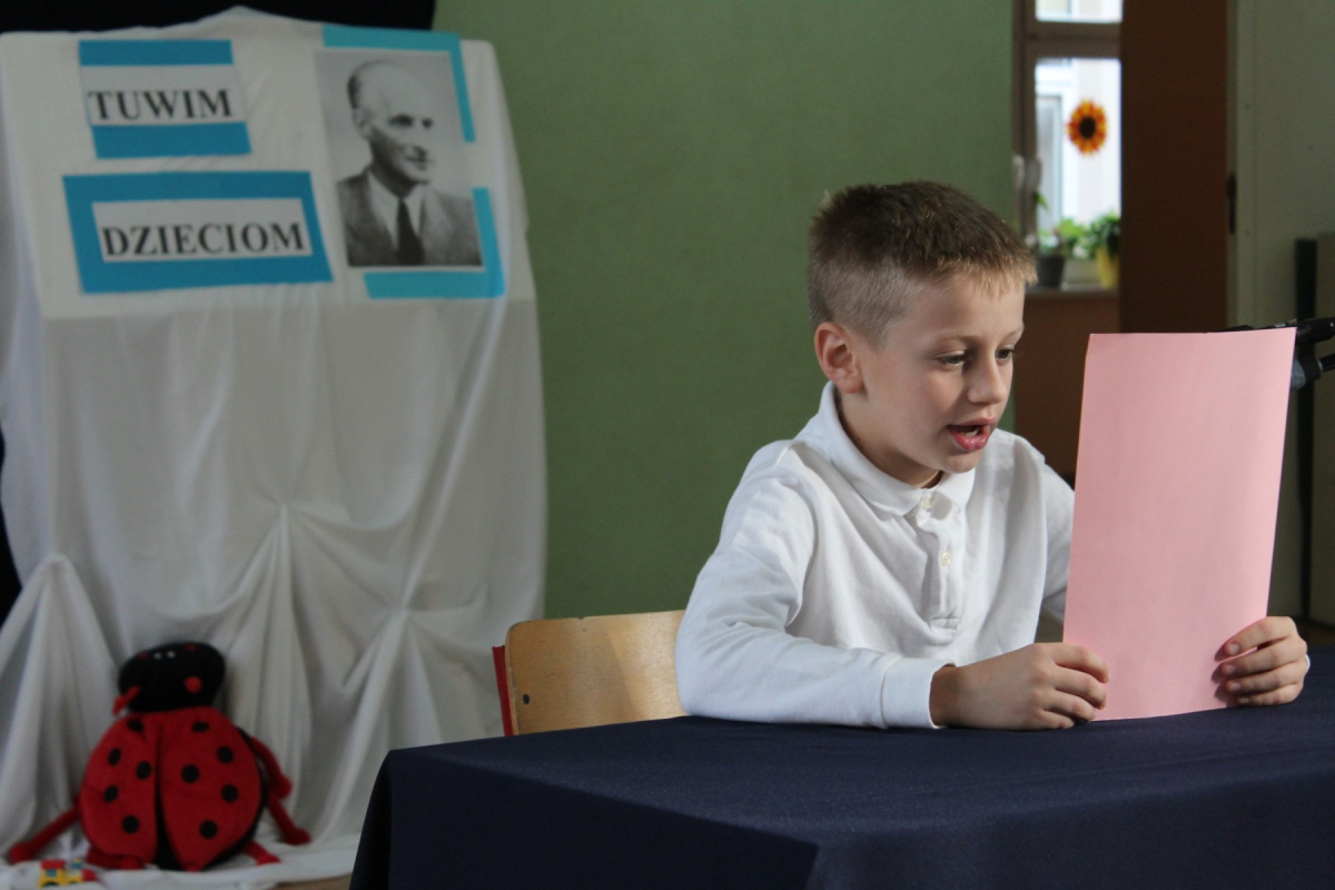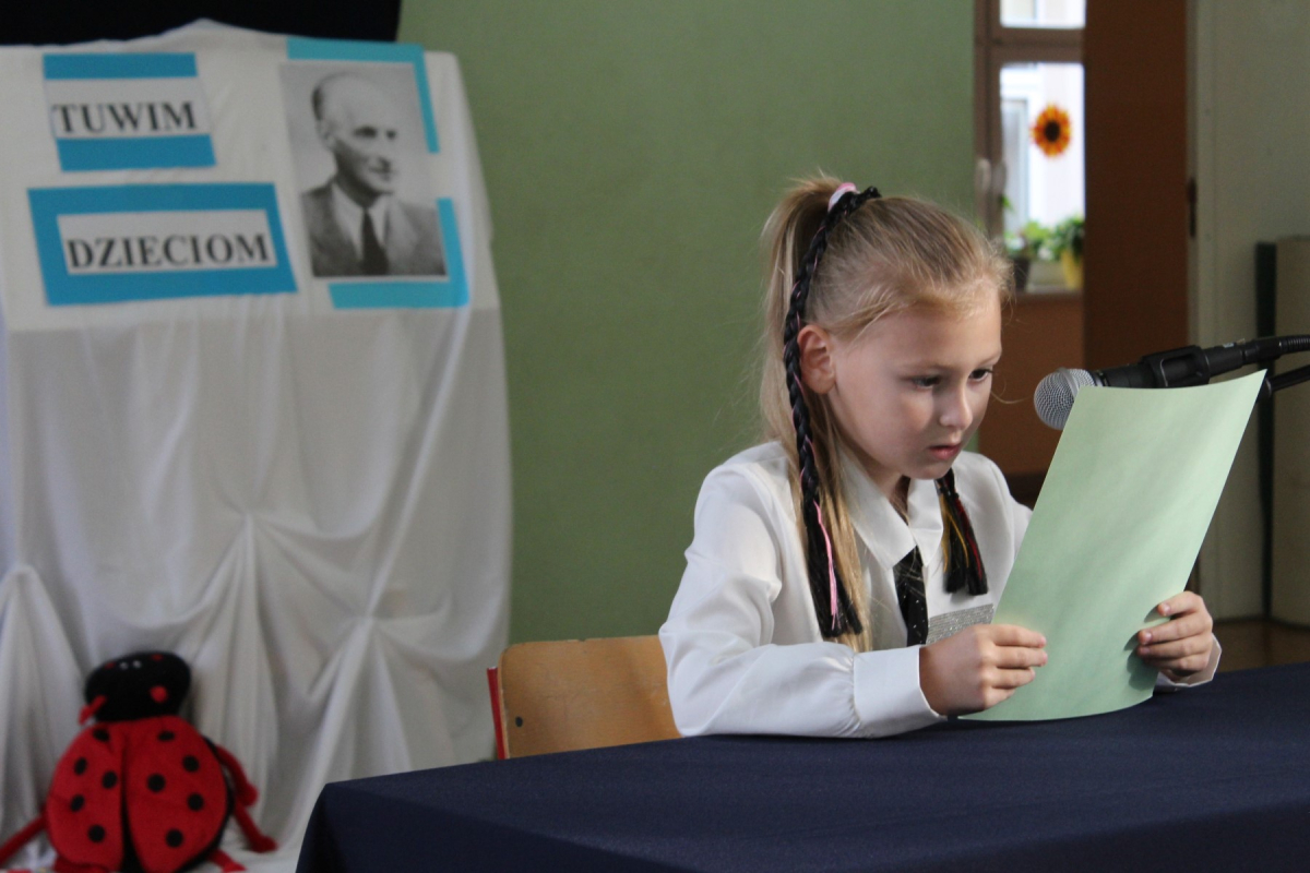 13 września przypadała 131 rocznica urodzin Juliana Tuwima – polskiego poety, satyryka, tłumacza, znanego z literatury dziecięcej i dorosłej. Z tej okazji, wspólne czytanie upłynęło pod hasłem „Tuwim Dzieciom”. W tym dniu dzieci z klasy II i III przygotowane przez wychowawcę zaprezentowały swoim młodszym kolegom i koleżankom z klasy I i oddziału przedszkolnego następujące wiersze: Brej Maja – „Wszyscy dla wszystkich”, Brej Michalina – „Abecadło”, Budziak Filip – „Pstryk”, Dedo Leon – „Dyzio Marzyciel”, Dedo Michał – „Skakanka”, Jędryczka Emilia – „O Grzesiu kłamczuchu i jego cioci”, Jędryczka Igor – „Warzywa”, Joncel Leon – „Zosia Samosia”, Maczuga Jessica – „Bambo”, Mikrut Ksawery – „Okulary”, Wyżkiewicz Bartłomiej – „Idzie Grześ”, Wyżkiewicz Filip – „Spóźniony słowik”. Podróż z wierszami Juliana Tuwima rozpoczęła pani Dyrektor prezentując wszystkim zebranym na sali gimnastycznej wiersz pt. ”Abecadło”. Do akcji z wielkim zaangażowaniem włączyli się uczniowie z klasy VIII. Lena Wyżkiewicz przybliżyła życiorys Juliana Tuwima, natomiast Józef Leśniak mistrzowsko zaprezentował wiersz pt. ”Ptasie radio”, które zostało nagrodzone przez wszystkich słuchających gromkimi brawami.