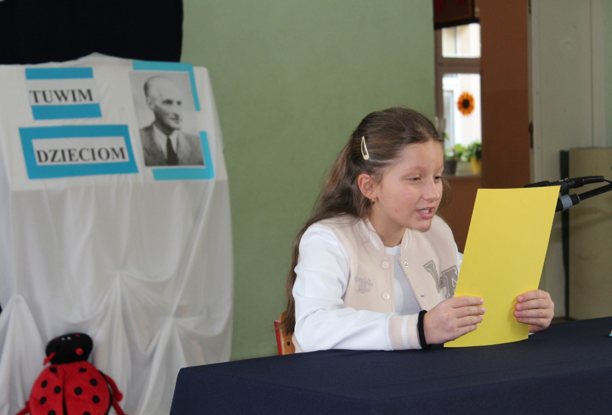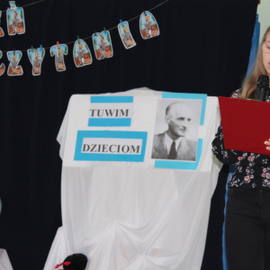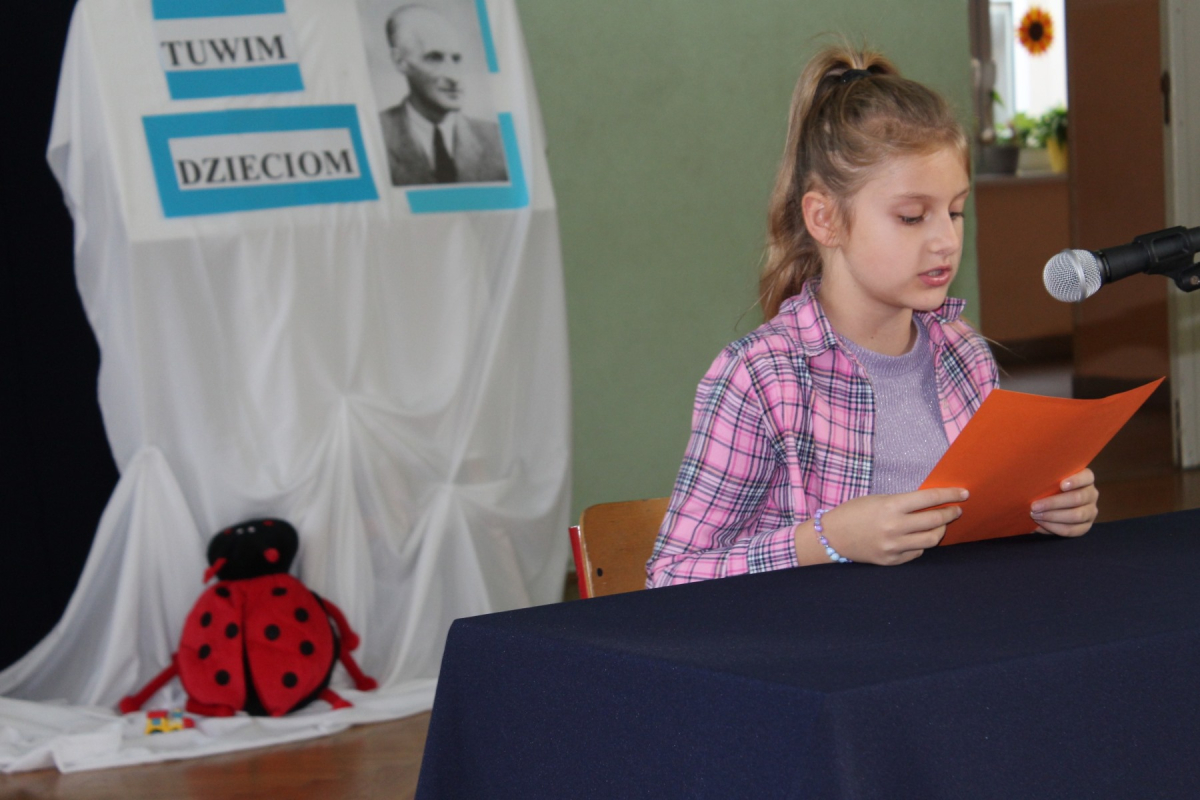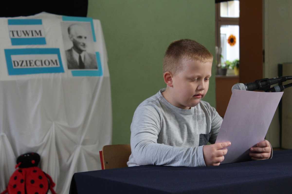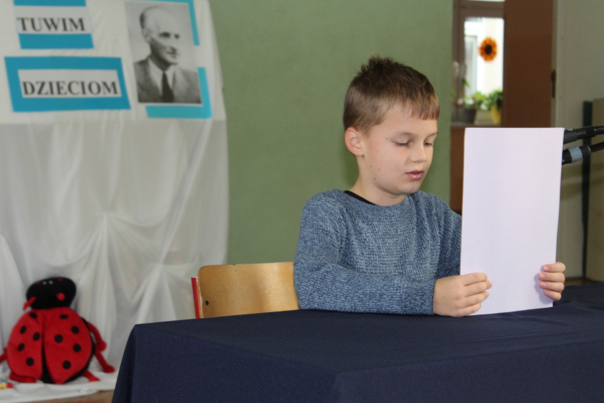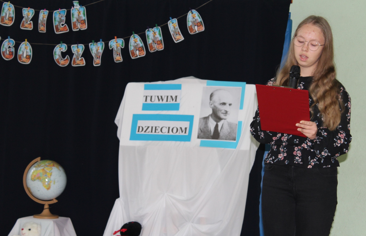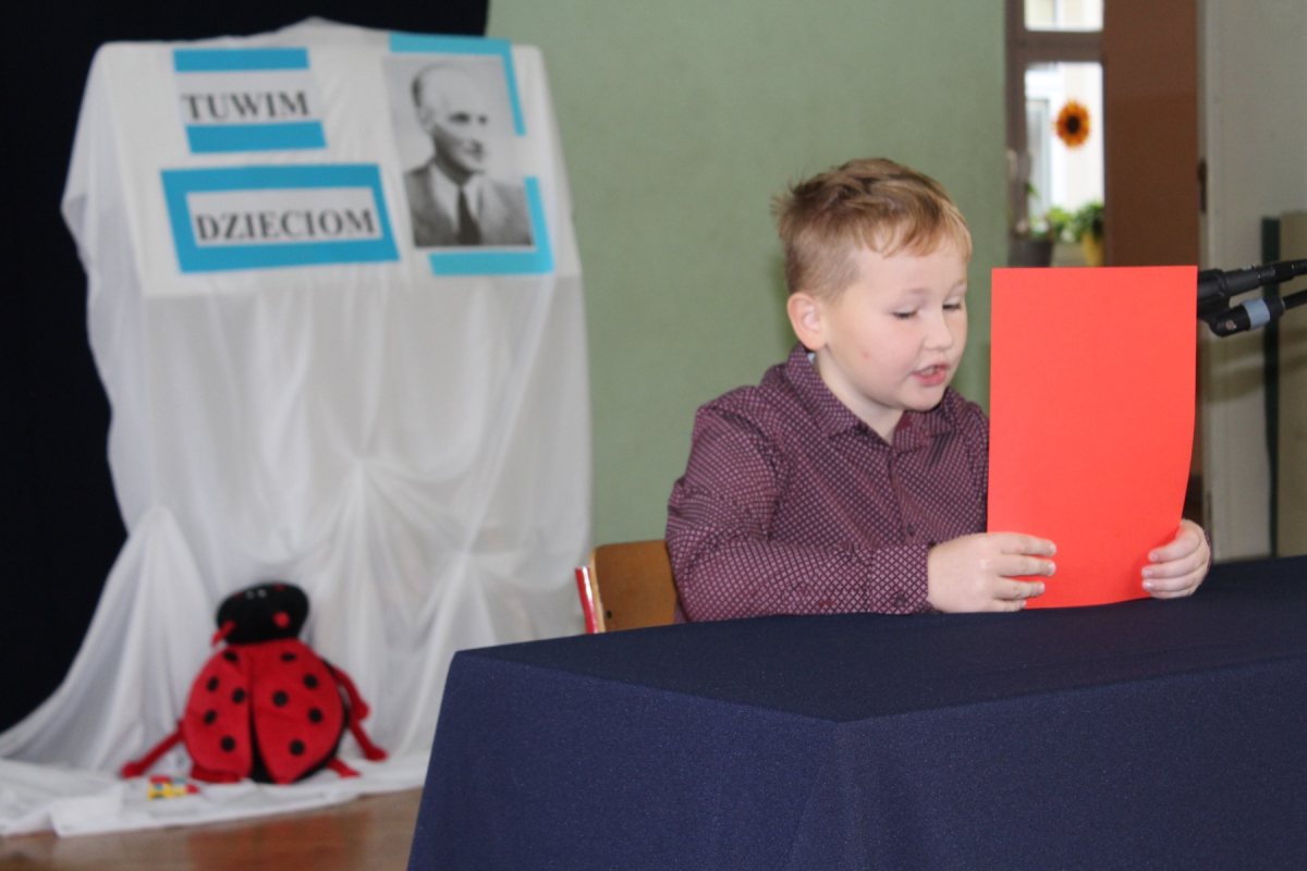 13 września przypadała 131 rocznica urodzin Juliana Tuwima – polskiego poety, satyryka, tłumacza, znanego z literatury dziecięcej i dorosłej. Z tej okazji, wspólne czytanie upłynęło pod hasłem „Tuwim Dzieciom”. W tym dniu dzieci z klasy II i III przygotowane przez wychowawcę zaprezentowały swoim młodszym kolegom i koleżankom z klasy I i oddziału przedszkolnego następujące wiersze: Brej Maja – „Wszyscy dla wszystkich”, Brej Michalina – „Abecadło”, Budziak Filip – „Pstryk”, Dedo Leon – „Dyzio Marzyciel”, Dedo Michał – „Skakanka”, Jędryczka Emilia – „O Grzesiu kłamczuchu i jego cioci”, Jędryczka Igor – „Warzywa”, Joncel Leon – „Zosia Samosia”, Maczuga Jessica – „Bambo”, Mikrut Ksawery – „Okulary”, Wyżkiewicz Bartłomiej – „Idzie Grześ”, Wyżkiewicz Filip – „Spóźniony słowik”. Podróż z wierszami Juliana Tuwima rozpoczęła pani Dyrektor prezentując wszystkim zebranym na sali gimnastycznej wiersz pt. ”Abecadło”. Do akcji z wielkim zaangażowaniem włączyli się uczniowie z klasy VIII. Lena Wyżkiewicz przybliżyła życiorys Juliana Tuwima, natomiast Józef Leśniak mistrzowsko zaprezentował wiersz pt. ”Ptasie radio”, które zostało nagrodzone przez wszystkich słuchających gromkimi brawami.