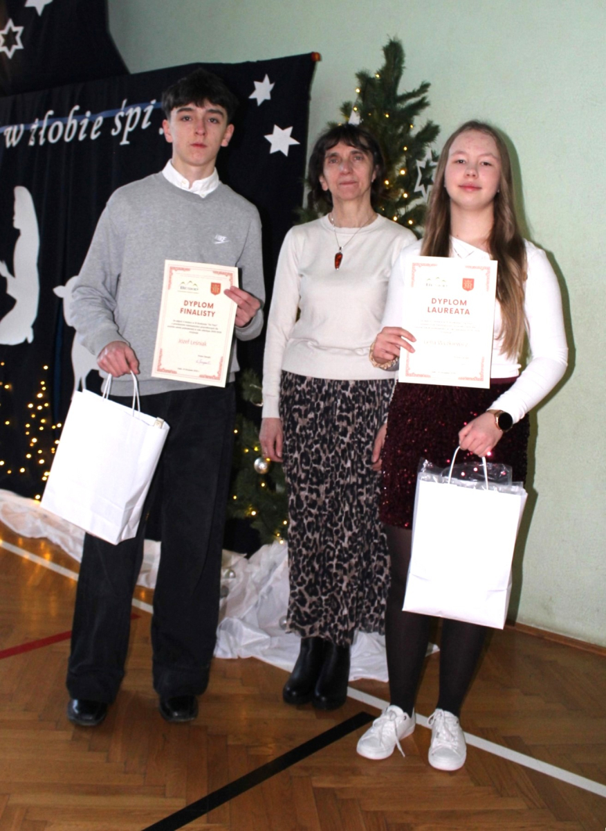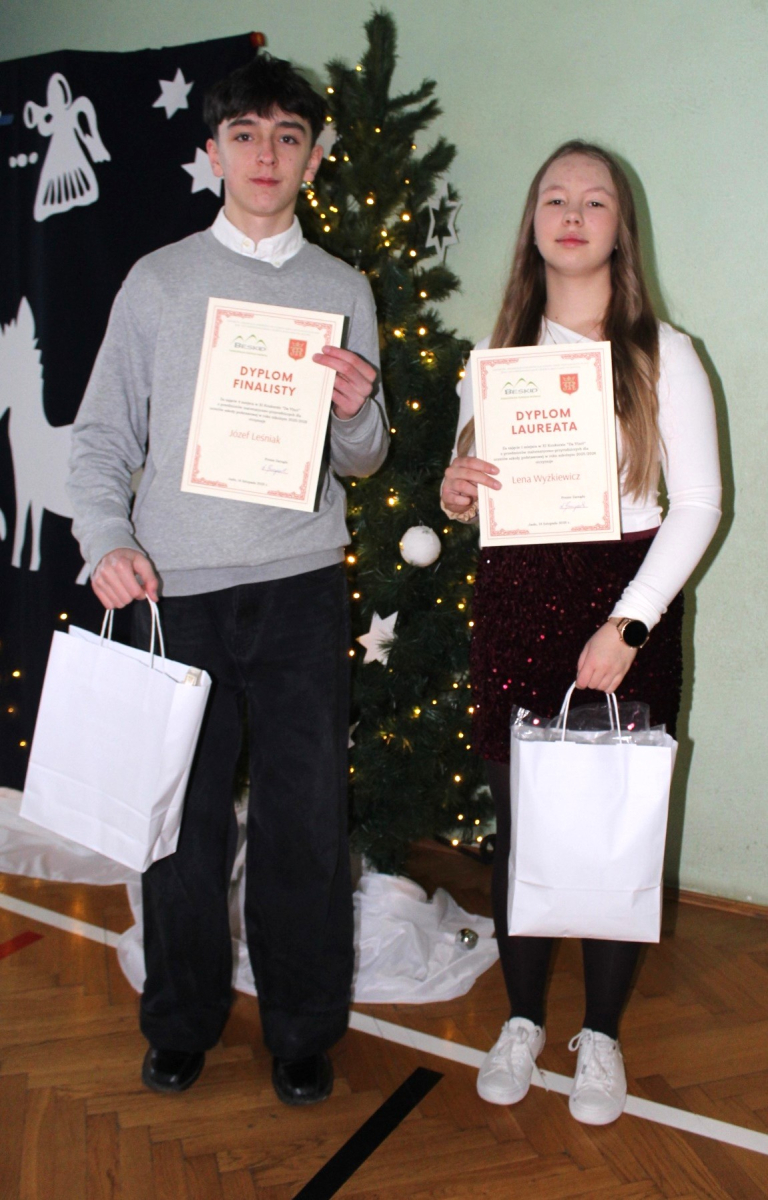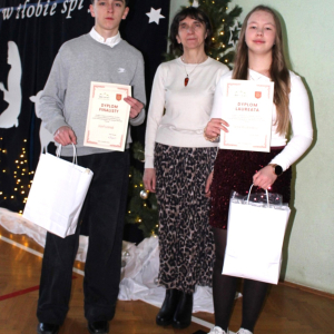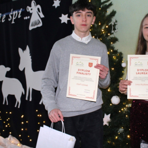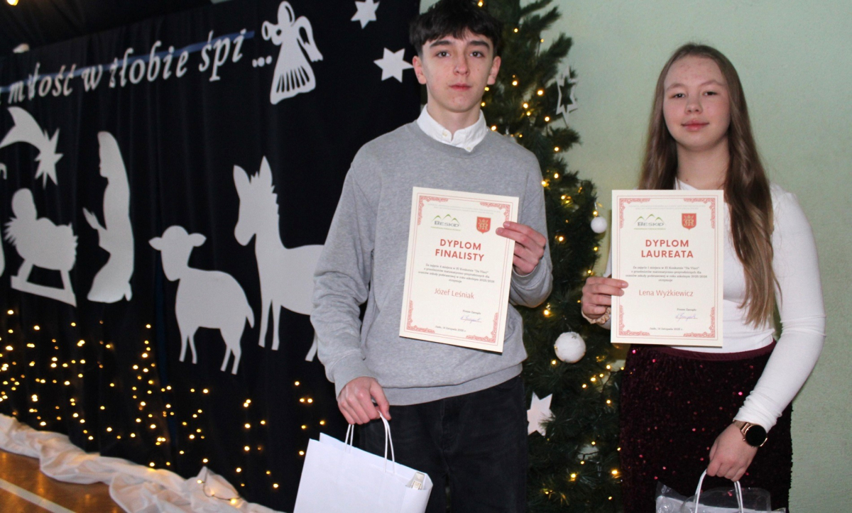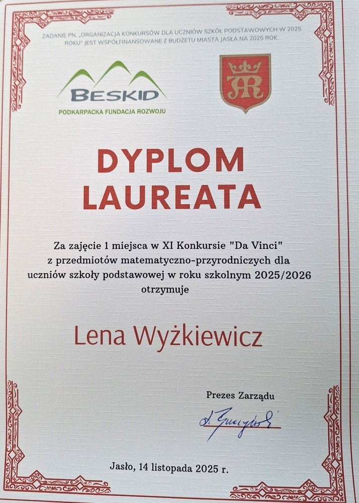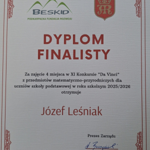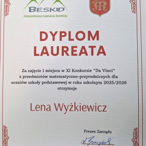 Z dumą informujemy o sukcesach naszych uczniów w jedenastej edycji Powiatowego Konkursu "Da Vinci" z przedmiotów matematyczno-przyrodniczych. Lena Wyżkiewicz zdobyła I miejsce i tytuł LAUREATA, natomiast IV miejsce i tytuł FINALISTY uzyskał Józef Leśniak. Powiatowy etap konkursu odbył się 14.IX.2025 r. i wzięło w nim udział ponad 140 uczniów ze szkół podstawowych powiatu jasielskiego. Naszą szkołę reprezentowali uczniowie klasy VIII: Joanna Klimkiewicz, Józef Leśniak, Martyna Maczuga i Lena Wyżkiewicz. Rozwiązując arkusz konkursowy przez 90 minut zmagali się oni z niełatwymi, mającymi różnorodną formę zadaniami interdyscyplinarnymi z zakresu: matematyki, fizyki, biologii, geografii i chemii. Biorąc pod uwagę bardzo dużą liczbę uczestników konkursu na wysokich miejscach uplasowały się również pozostałe uczennice naszej szkoły zajmując: Joanna Klimkiewicz 11 miejsce, a Martyna Maczuga 19 miejsce.Konkurs organizowany przez Podkarpacką Fundację Rozwoju "Beskid" znajduje się na liście kuratoryjnej konkursów, które mogą być wpisane na świadectwie. Pamiątkowe dyplomy i nagrody zostały przekazane uczniom 19.12.2025 roku. Serdecznie gratulujemy i życzymy dalszych sukcesów na kolejnych etapach edukacyjnych! /B. Piątkiewicz/