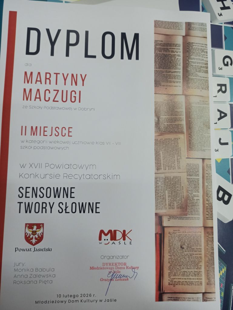 Z radością informujemy, że Martyna Maczuga, uczennica klasy VIII, zdobyła II miejsce w XVII Powiatowym Konkursie Recytatorskim „Sensowne Twory Słowne”, który odbył się 10 lutego 2026 roku w Młodzieżowym Domu Kultury w Jaśle. Tegoroczna edycja konkursu odbywała się pod hasłem „Odpowiedzialni za świat”, a uczestnicy prezentowali wybrany tekst np. wiersz lub fragment prozy, nawiązujący do tematyki związanej m.in. z odpowiedzialnością za drugiego człowieka, sprzeciwem wobec przemocy i niesprawiedliwości oraz troską o przyszłość naszej planety. Martyna zaprezentowała utwór „Ogrzej mnie” autorstwa Wojciecha Młynarskiego, zachwycając jury doborem repertuaru, dojrzałą interpretacją oraz dużą wrażliwością artystyczną. Komisja konkursowa oceniała uczestników według kryteriów zawartych w regulaminie, takich jak dobór repertuaru, interpretacja, warsztat recytatorski oraz ogólny wyraz artystyczny. Serdecznie gratulujemy Martynie sukcesu i życzymy kolejnych wspaniałych osiągnięć na scenie./ŻP/