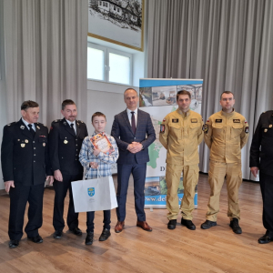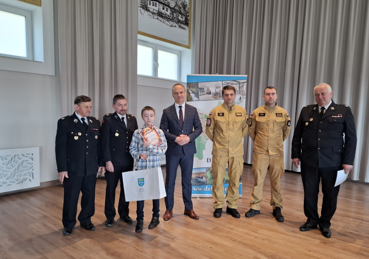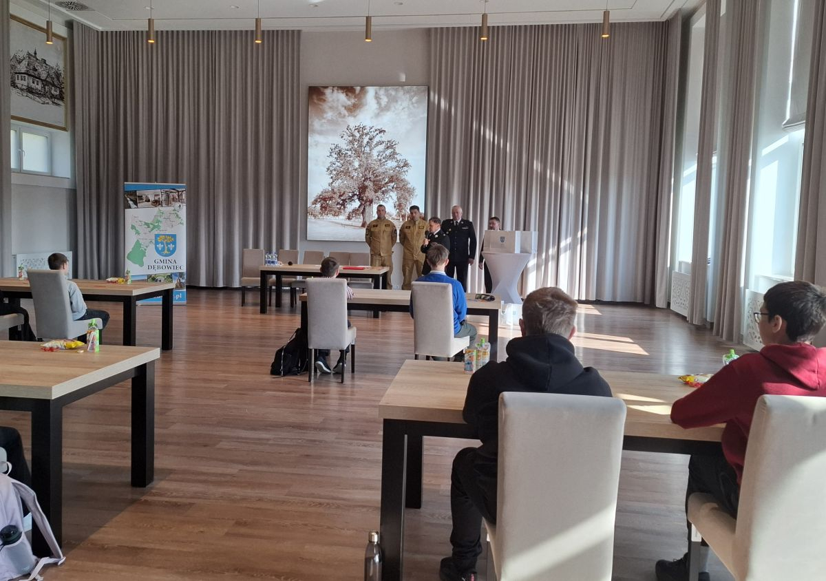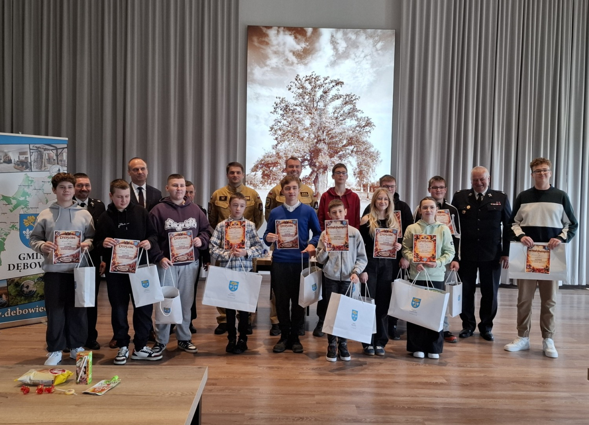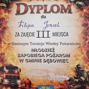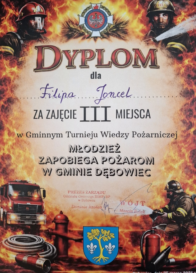 25 marca 2026 roku w Centrum Kulturalno-Sportowym w Dębowcu odbyły się Gminne Eliminacje Ogólnopolskiego Turnieju Wiedzy Pożarniczej "Młodzież zapobiega pożarom". Do turnieju przystąpili uczniowie szkół podstawowych z terenu Gminy Dębowiec.Turniej składał się z 2 etapów – pisemnego w formie testu oraz ustnego w formie otwartych pytań. Naszą szkołę reprezentował uczeń klasy VI - Filip Joncel, który zajął III miejsce! Wszyscy uczestnicy turnieju otrzymali dyplomy i nagrody rzeczowe ufundowane przez Wójta Gminy Dębowiec Pana Marcina Bolka.Serdecznie gratulujemy!/JB/