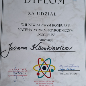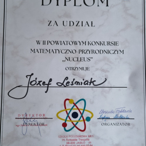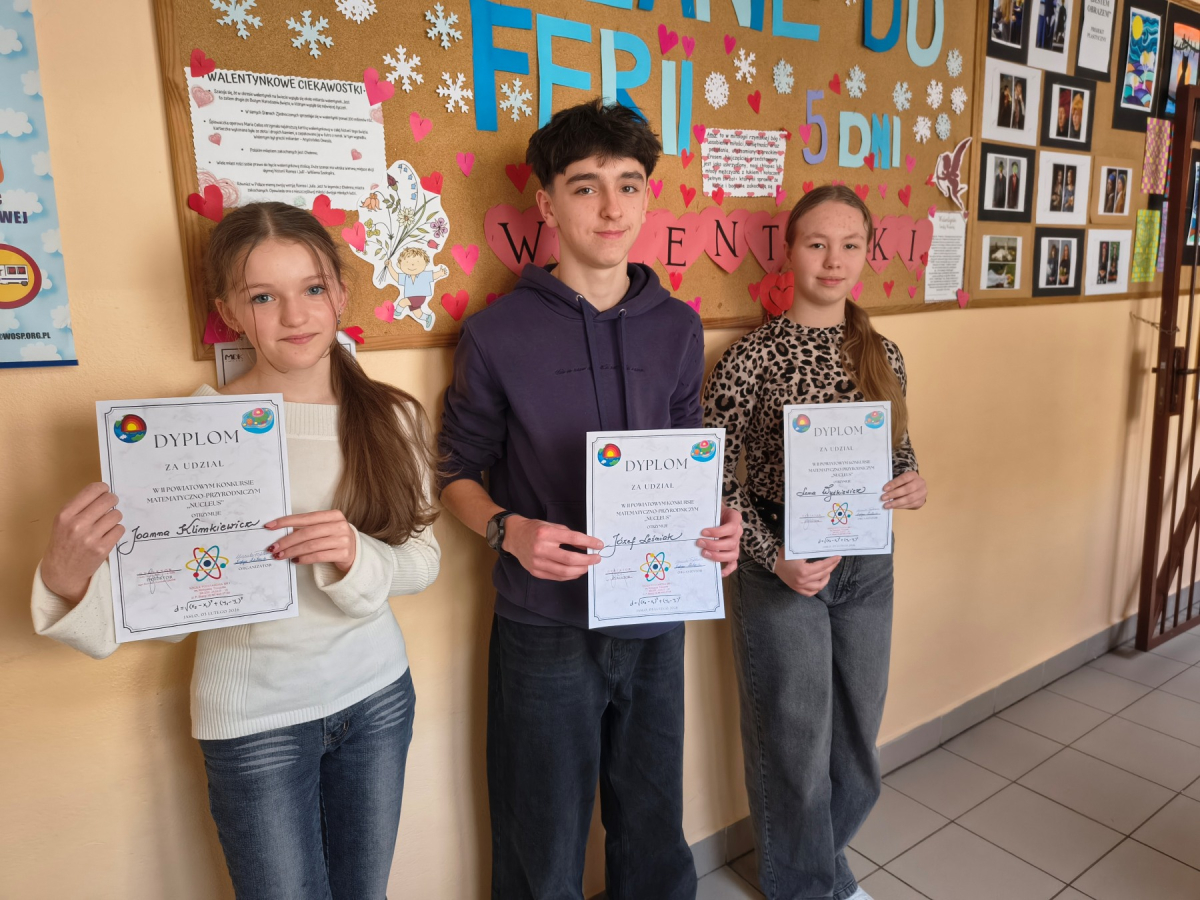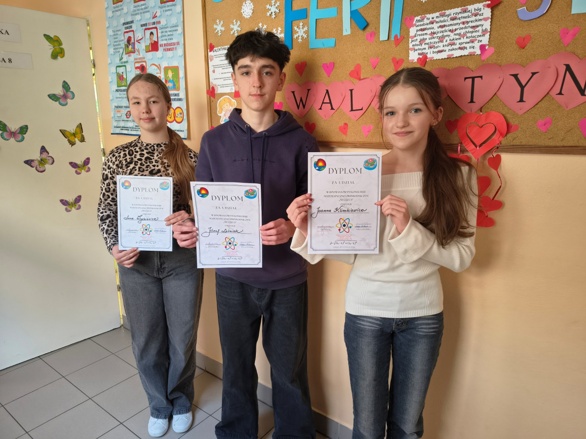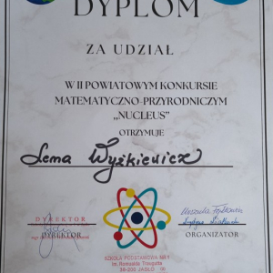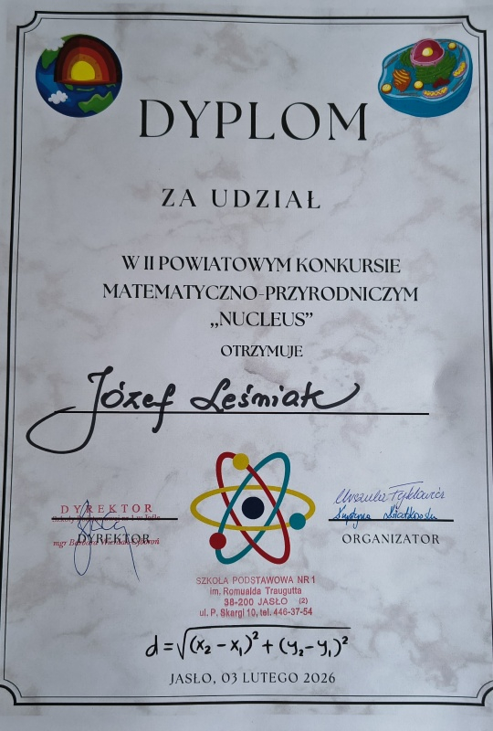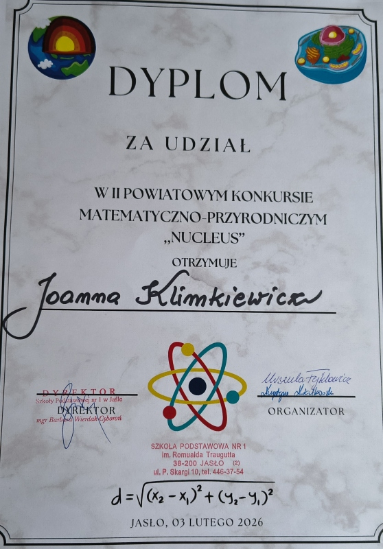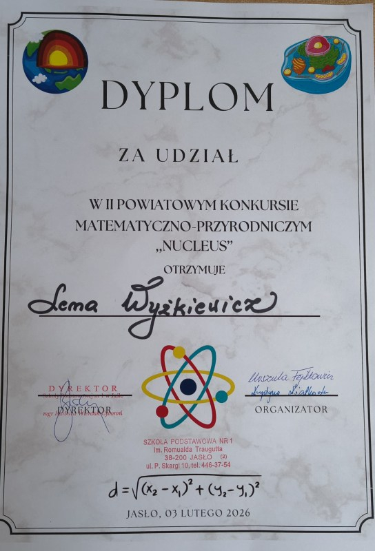 04.02.2026 r. zostały ogłoszone wyniki II Powiatowego Konkursu Matematyczno-Przyrodniczego "NUCLEUS", który odbył się 03.02. 2026 r. w Szkole Podstawowej nr 1 im. Romualda Traugutta w Jaśle. Konkurs skierowany był do uczniów klas VIII powiatu jasielskiego, a jego uczestnicy musieli wykazać się wiedzą i umiejętnościami zawartymi w podstawie programowej kształcenia ogólnego dla szkoły podstawowej z następujących przedmiotów: matematyka, biologia, geografia, fizyka i chemia. Uczestnicy przez 90 minut rozwiązywali test zawierający interdyscyplinarne zadania zarówno zamknięte jak i otwarte. Naszą szkołę w ww. konkursie reprezentowali: Joanna Klimkiewicz, Józef Leśniak i Lena Wyżkiewicz. Biorąc pod uwagę dużą liczbę uczestników konkursu, bo aż 36 uczniów - nasi ósmoklasiści uplasowali się na wysokich miejscach. W pierwszej dziesiątce znaleźli się Lena i Józef zajmując ex aequo 6 miejsce, natomiast Joanna zdobyła miejsce 12.