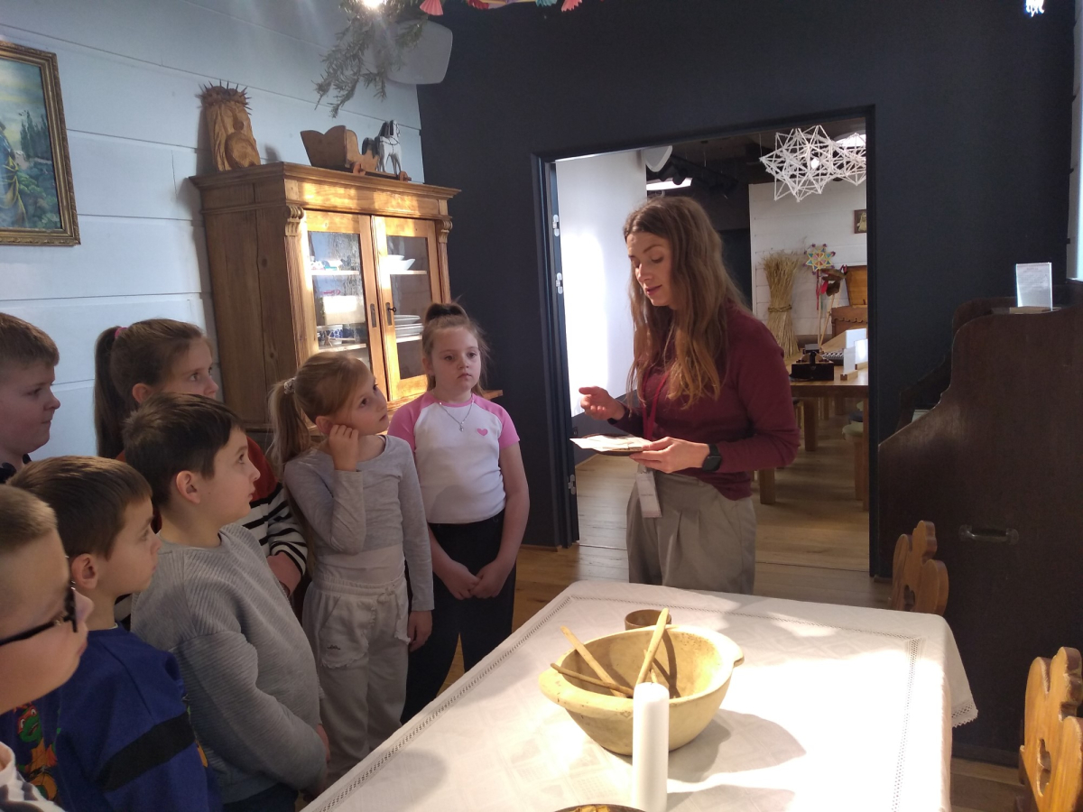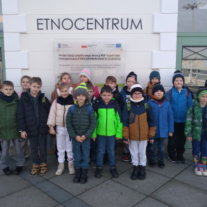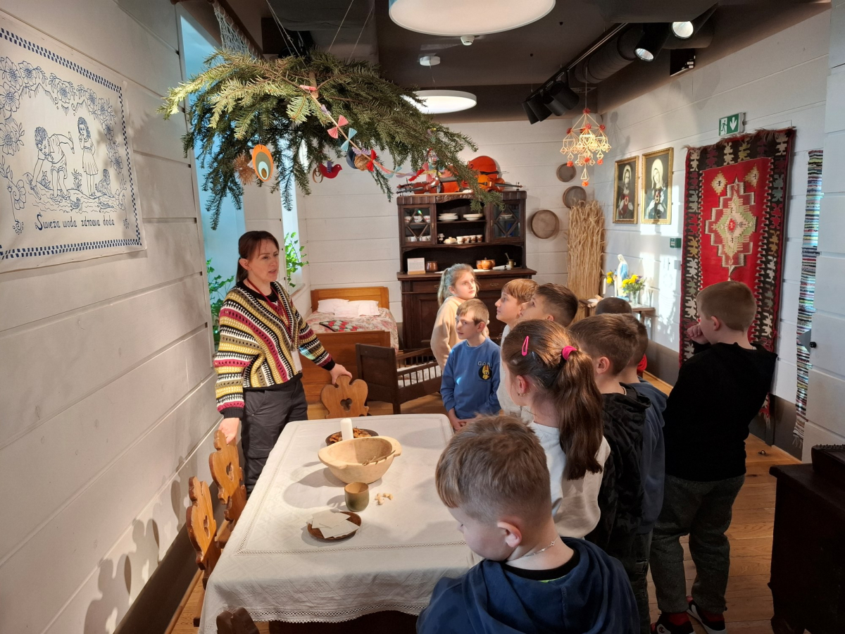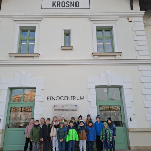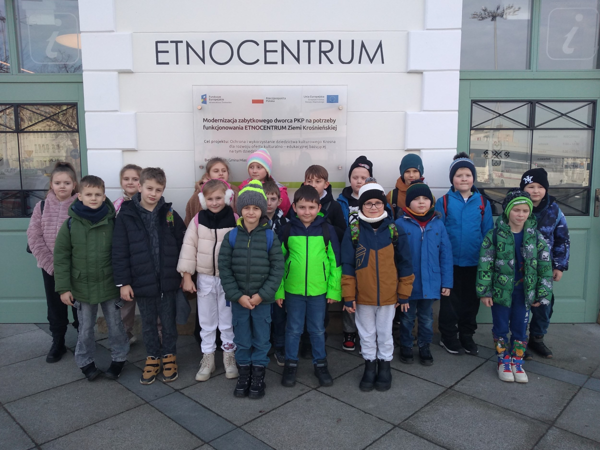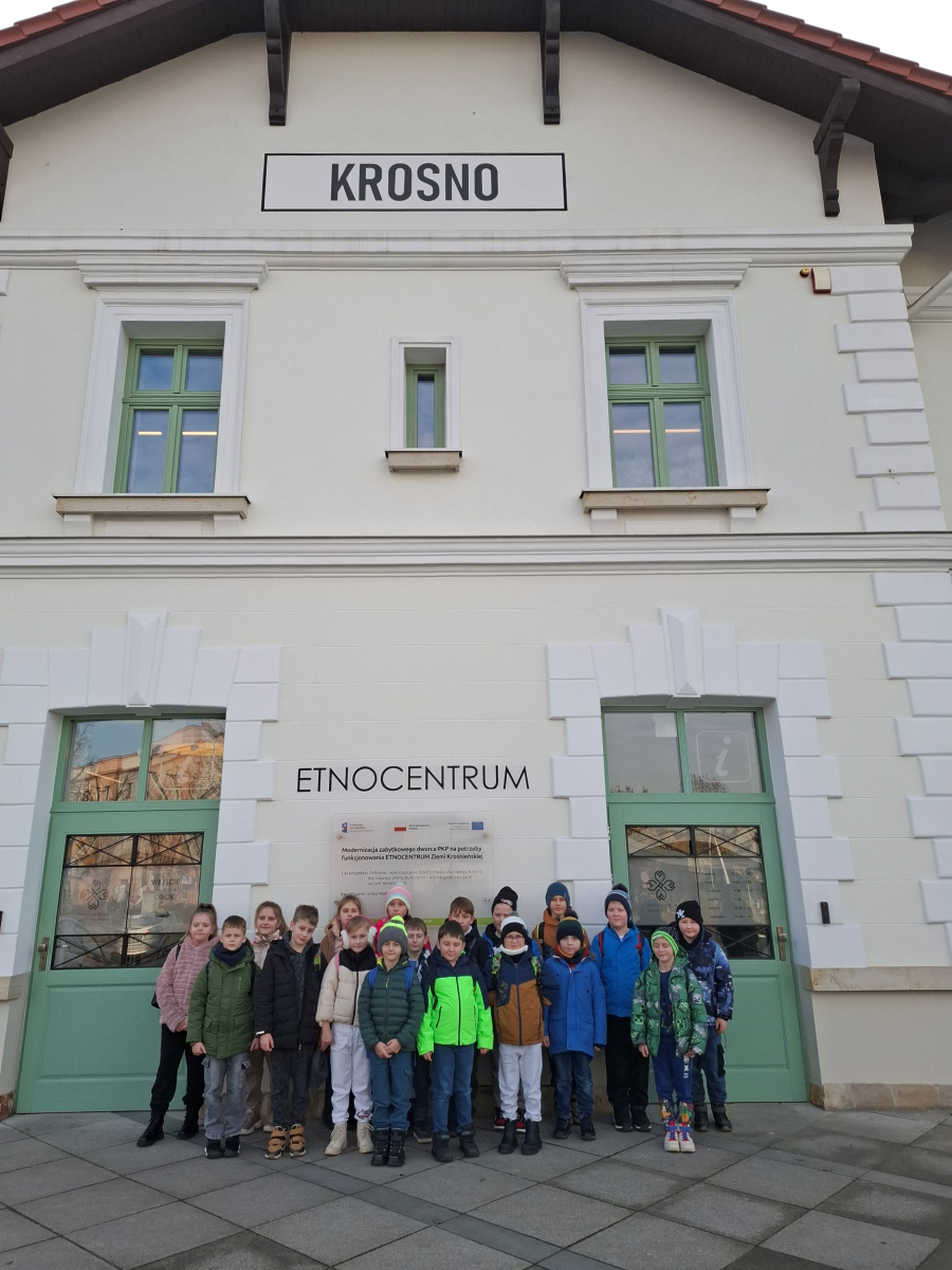Kolejnym punktem wycieczki była wizyta w Etnocentrum Ziemi Krośnieńskiej oraz warsztaty rękodzielnicze. Dzieci zwiedzając sale stylizowane na historyczne miejsca zwane Podworcem, Pasternikiem, Izbą weselną i Izbą gościnną poznały dawne, dziś częsta zapomniane zwyczaje bożonarodzeniowe. Wszyscy wzięli udział w zajęciach plastycznych i wykonali własnoręcznie drewniane magnesy z motywem świątecznym. W trakcie zwiedzania uczniowie mogli skorzystać z wielu atrakcyjnych i nowoczesnych multimediów, m.in. Etnokaraoke, dzięki czemu mogli wspólnie zaśpiewać wybrane pieśni. Dużą popularnością cieszyła się także sala legend oraz multimedialne gry i zabawy w podziemiach Etnocentrum. Wycieczka była nie tylko ciekawa, ale przede wszystkim pouczająca. Dzieci zdobyły wiedzę o dawnych zwyczajach, rozwijały kreatywność, zdolności manualne, a także poczuły prawdziwą magię świąt./AR/