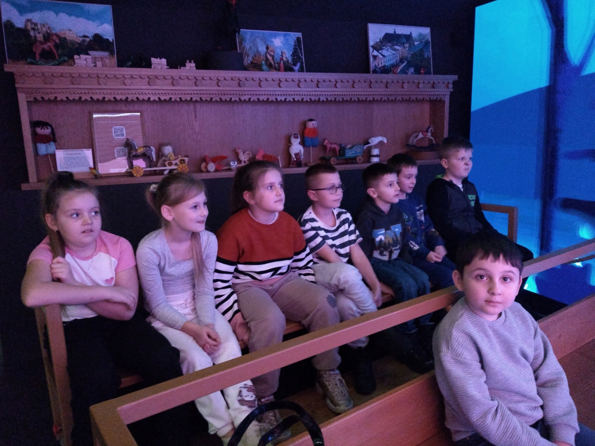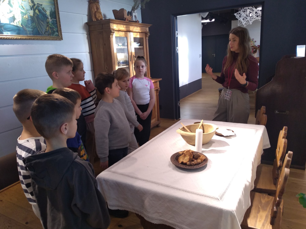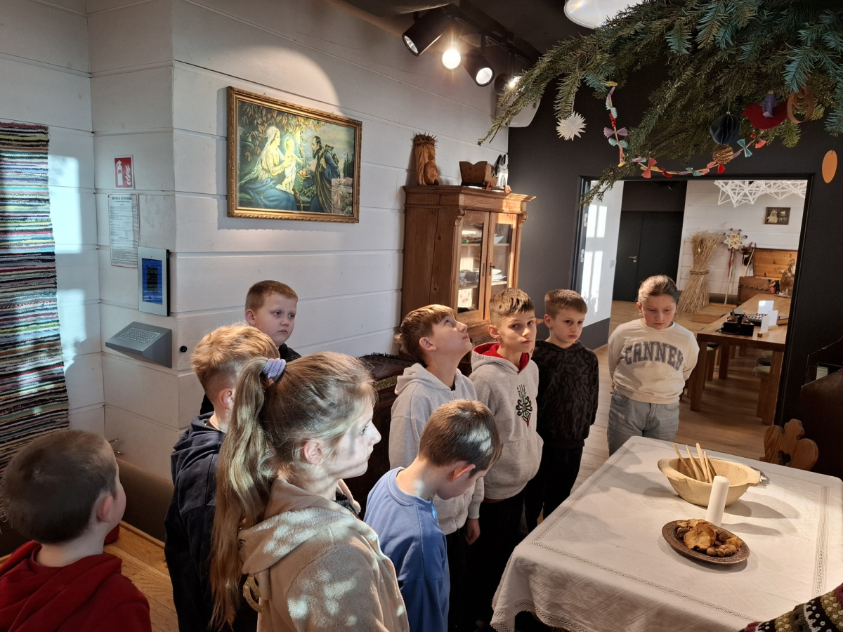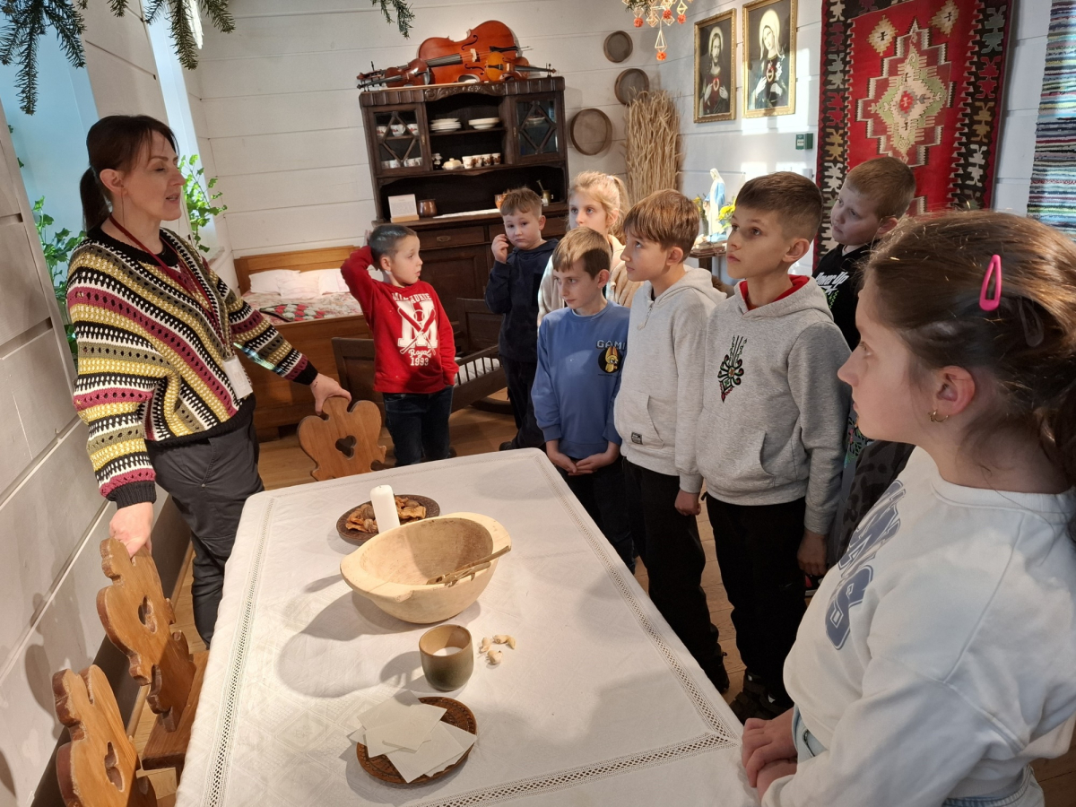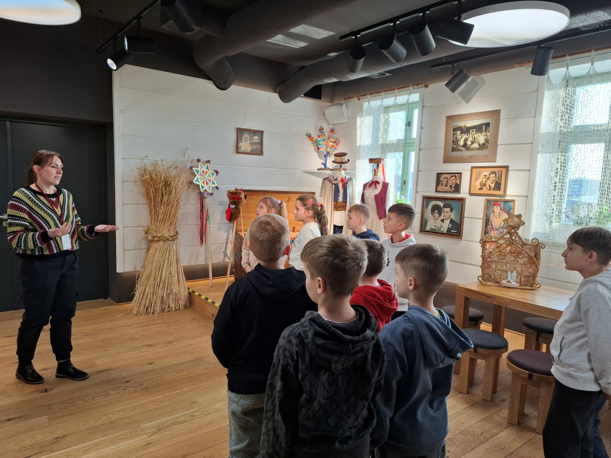 Kolejnym punktem wycieczki była wizyta w Etnocentrum Ziemi Krośnieńskiej oraz warsztaty rękodzielnicze. Dzieci zwiedzając sale stylizowane na historyczne miejsca zwane Podworcem, Pasternikiem, Izbą weselną i Izbą gościnną poznały dawne, dziś częsta zapomniane zwyczaje bożonarodzeniowe. Wszyscy wzięli udział w zajęciach plastycznych i wykonali własnoręcznie drewniane magnesy z motywem świątecznym. W trakcie zwiedzania uczniowie mogli skorzystać z wielu atrakcyjnych i nowoczesnych multimediów, m.in. Etnokaraoke, dzięki czemu mogli wspólnie zaśpiewać wybrane pieśni. Dużą popularnością cieszyła się także sala legend oraz multimedialne gry i zabawy w podziemiach Etnocentrum. Wycieczka była nie tylko ciekawa, ale przede wszystkim pouczająca. Dzieci zdobyły wiedzę o dawnych zwyczajach, rozwijały kreatywność, zdolności manualne, a także poczuły prawdziwą magię świąt./AR/