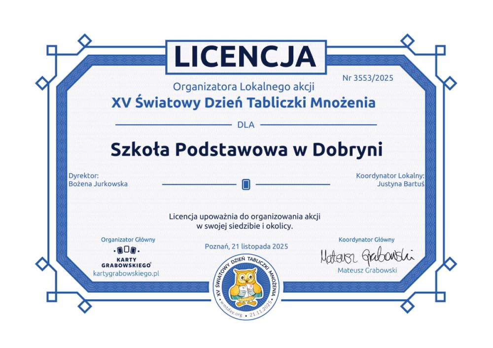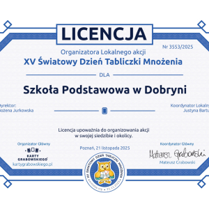 Na zakończenie uczniowie otrzymali odznakę "Eksperta Tabliczki Mnożenia". Dodatkowo nasza szkoła otrzymała oficjalną licencję – dyplom za udział w ogólnopolskiej odsłonie XV Światowego Dnia Tabliczki Mnożenia, co stanowi dla nas powód do dumy! To był dzień pełen radości, nauki i współpracy. Udowodniliśmy, że matematyka może być fascynującą przygodą!/JB/