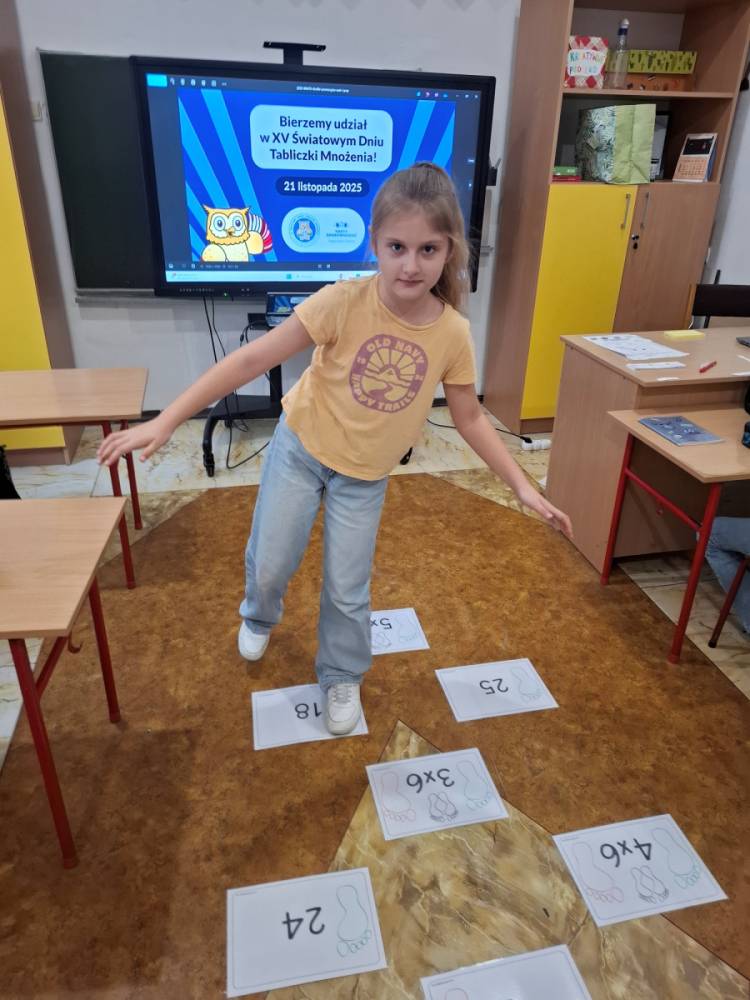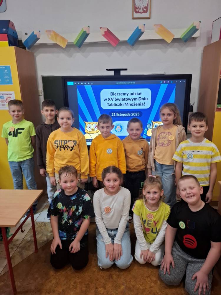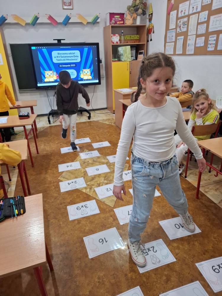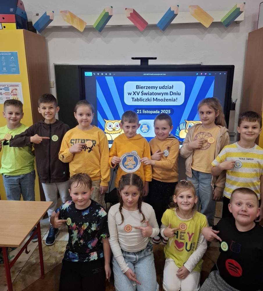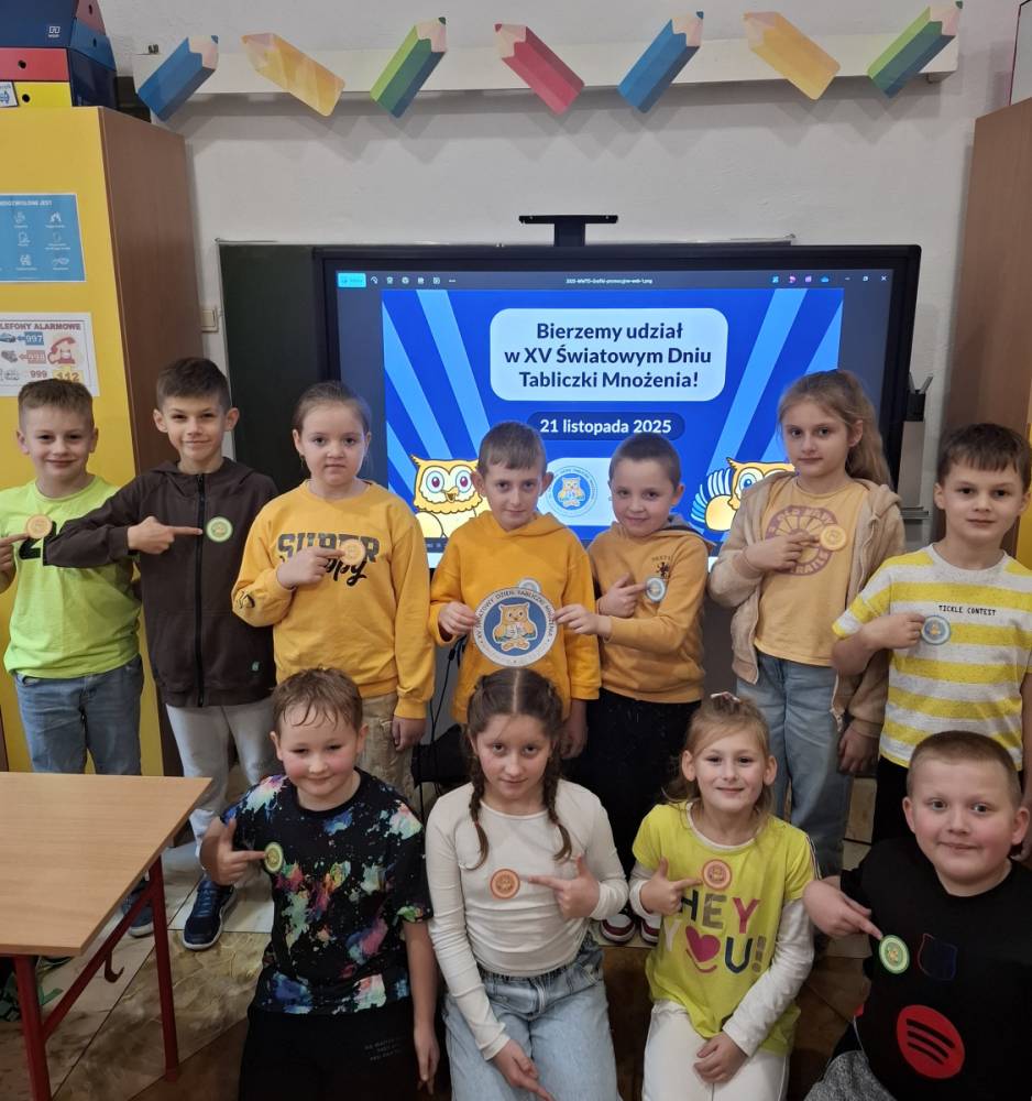 21.11.2025 roku nasza szkoła świętowała XV Światowy Dzień Tabliczki Mnożenia. W tym roku dołączyliśmy do akcji, której celem jest propagowanie nauki matematyki poprzez zabawę i współpracę. W wydarzeniu brały udział klasy II i III oraz IV i V. Na młodszych uczniów czekały specjalnie przygotowane zadania z mnożenia i dzielenia. Każdy uczestnik musiał wykonać zestaw działań, a następnie wymienić się kartą z kolegą lub koleżanką, aby wzajemnie sprawdzić poprawność obliczeń. Ta forma współdziałania nie tylko utrwalała wiedzę, lecz także uczyła odpowiedzialności i dokładności. Pojawiły się też matematyczne kolorowanki, karty, gry stolikowe oraz "skaczącą" tabliczka mnożenia. Uczniowie pracowali również z materiałami zawierającymi logo akcji oraz rozwiązywali zagadki prowadzące do odczytania ukrytego hasła. Starsze klasy, czyli uczniowie IV i V mieli okazję sprawdzić swoje umiejętności w formie komputerowej. Specjalne zestawy działań, quizy i ćwiczenia pozwoliły połączyć naukę z wykorzystaniem nowoczesnych technologii.