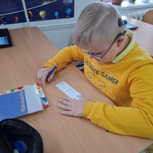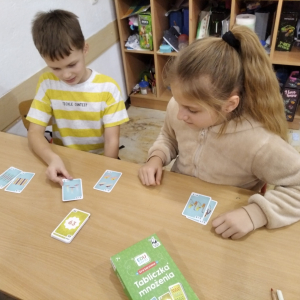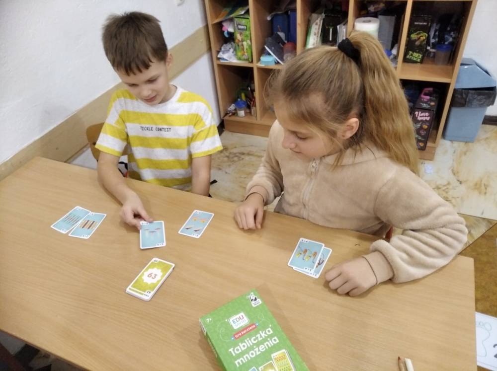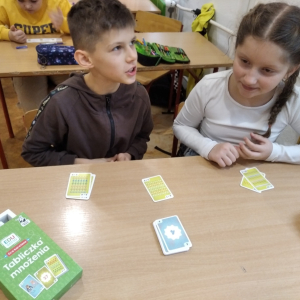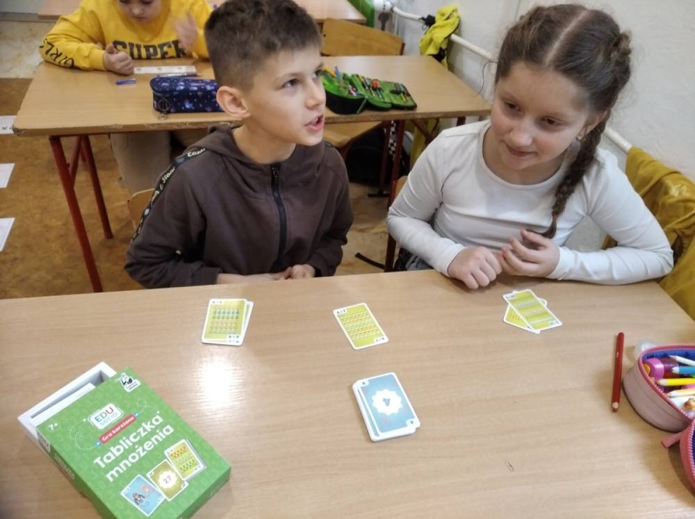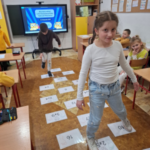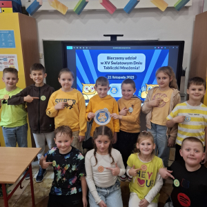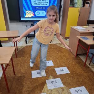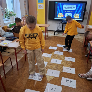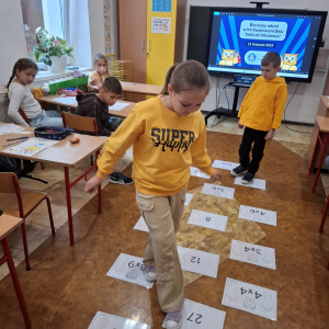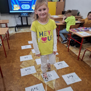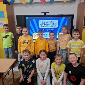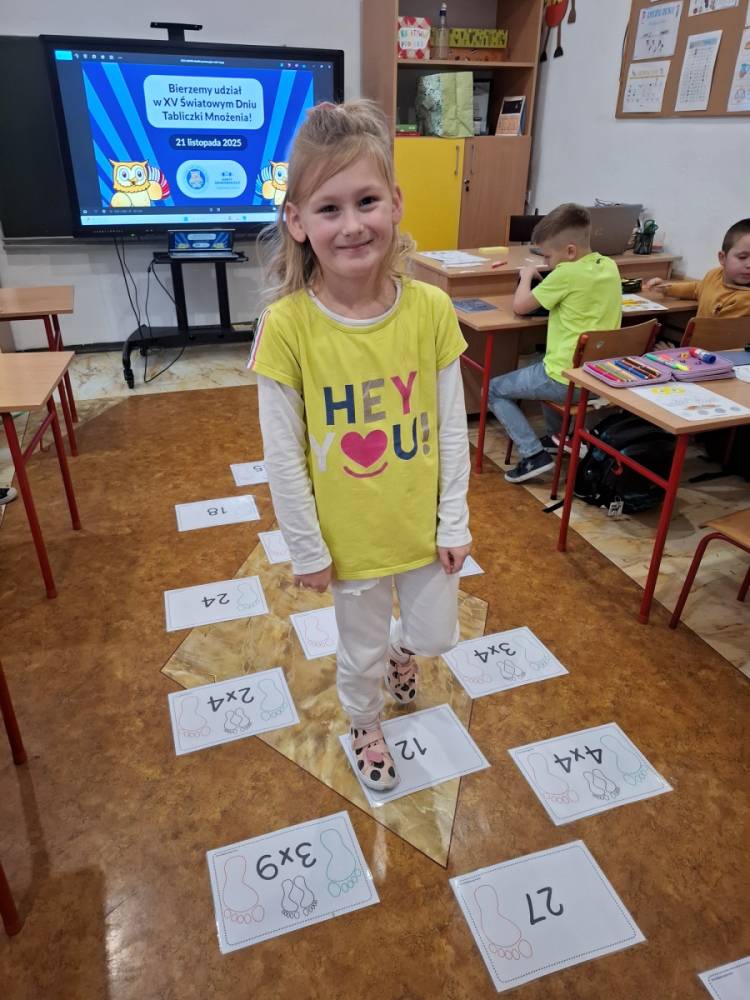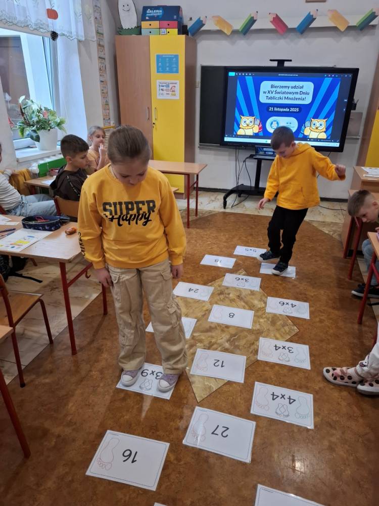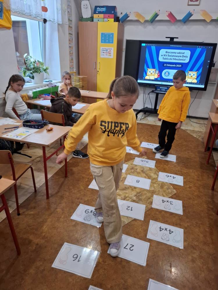 21.11.2025 roku nasza szkoła świętowała XV Światowy Dzień Tabliczki Mnożenia. W tym roku dołączyliśmy do akcji, której celem jest propagowanie nauki matematyki poprzez zabawę i współpracę. W wydarzeniu brały udział klasy II i III oraz IV i V. Na młodszych uczniów czekały specjalnie przygotowane zadania z mnożenia i dzielenia. Każdy uczestnik musiał wykonać zestaw działań, a następnie wymienić się kartą z kolegą lub koleżanką, aby wzajemnie sprawdzić poprawność obliczeń. Ta forma współdziałania nie tylko utrwalała wiedzę, lecz także uczyła odpowiedzialności i dokładności. Pojawiły się też matematyczne kolorowanki, karty, gry stolikowe oraz "skaczącą" tabliczka mnożenia. Uczniowie pracowali również z materiałami zawierającymi logo akcji oraz rozwiązywali zagadki prowadzące do odczytania ukrytego hasła. Starsze klasy, czyli uczniowie IV i V mieli okazję sprawdzić swoje umiejętności w formie komputerowej. Specjalne zestawy działań, quizy i ćwiczenia pozwoliły połączyć naukę z wykorzystaniem nowoczesnych technologii.