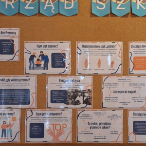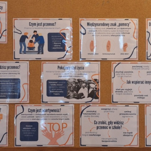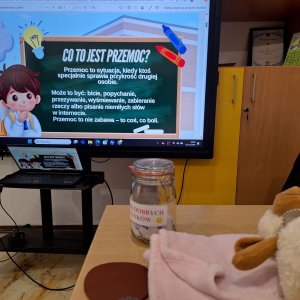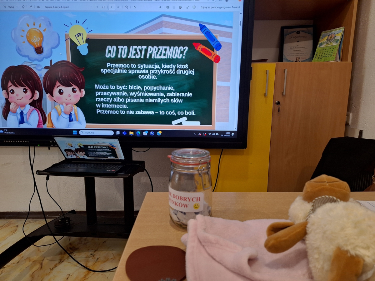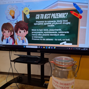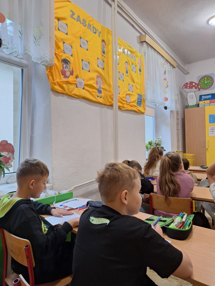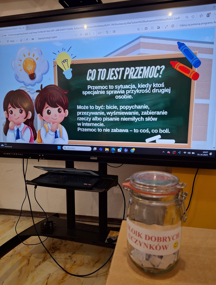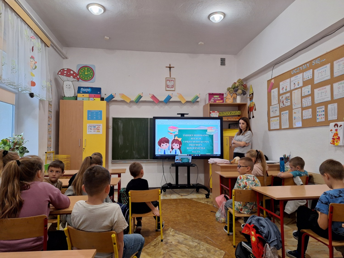 W ramach „Tygodnia Budowania Relacji i Przeciwdziałania Przemocy Rówieśniczej” uczniowie klas 1-3 wzięli udział w lekcji pt. „Kim jestem dla siebie? Kim jestem dla innych?”. Wysłuchali m. in. interaktywnej opowieści o tym, jak czujemy się w grupie, co może nas skrzywdzić oraz jak sami wpływamy na innych swoim zachowaniem. Wszyscy stwierdzili, że miło jest mieć przy sobie taką osobę, która jest jak „miękki pluszak” czy „ciepły kocyk”, a nie jak „kolczasta piłka” i „szorstki papier”, które często ranią fizycznie i psychicznie. W trakcie zajęć dzieci uczyły się także zmieniać nieprzyjemne myśli na swój temat na coś pozytywnego. Na zakończenie wszyscy wspólnie stworzyli „Klasowe drzewo życzliwości”, wpisując na liściach zachowania, które wzmacniają klasę, a na kamieniach te, które osłabiają klasę i wzajemne relacje./A. Ryba/