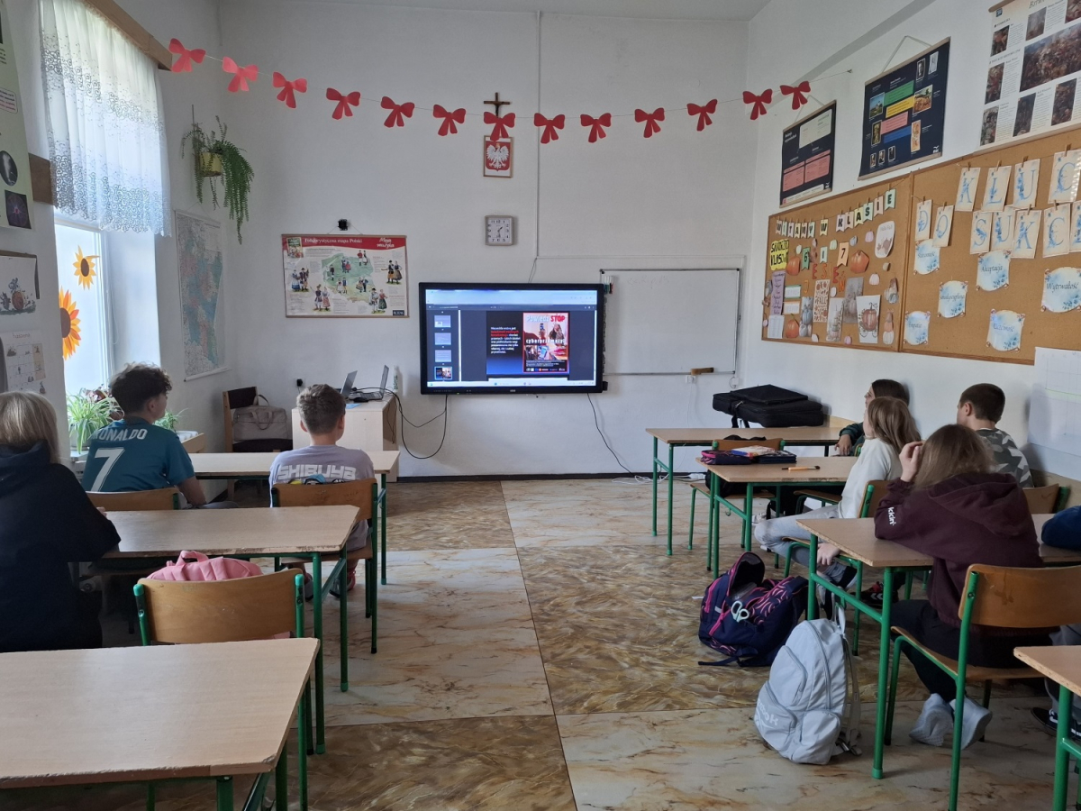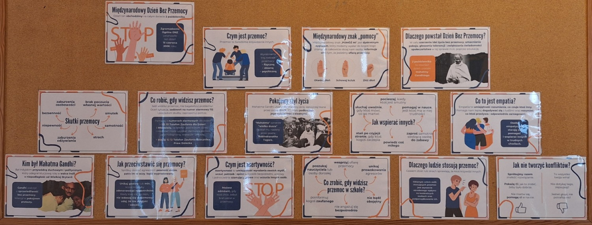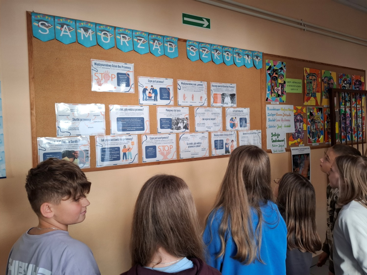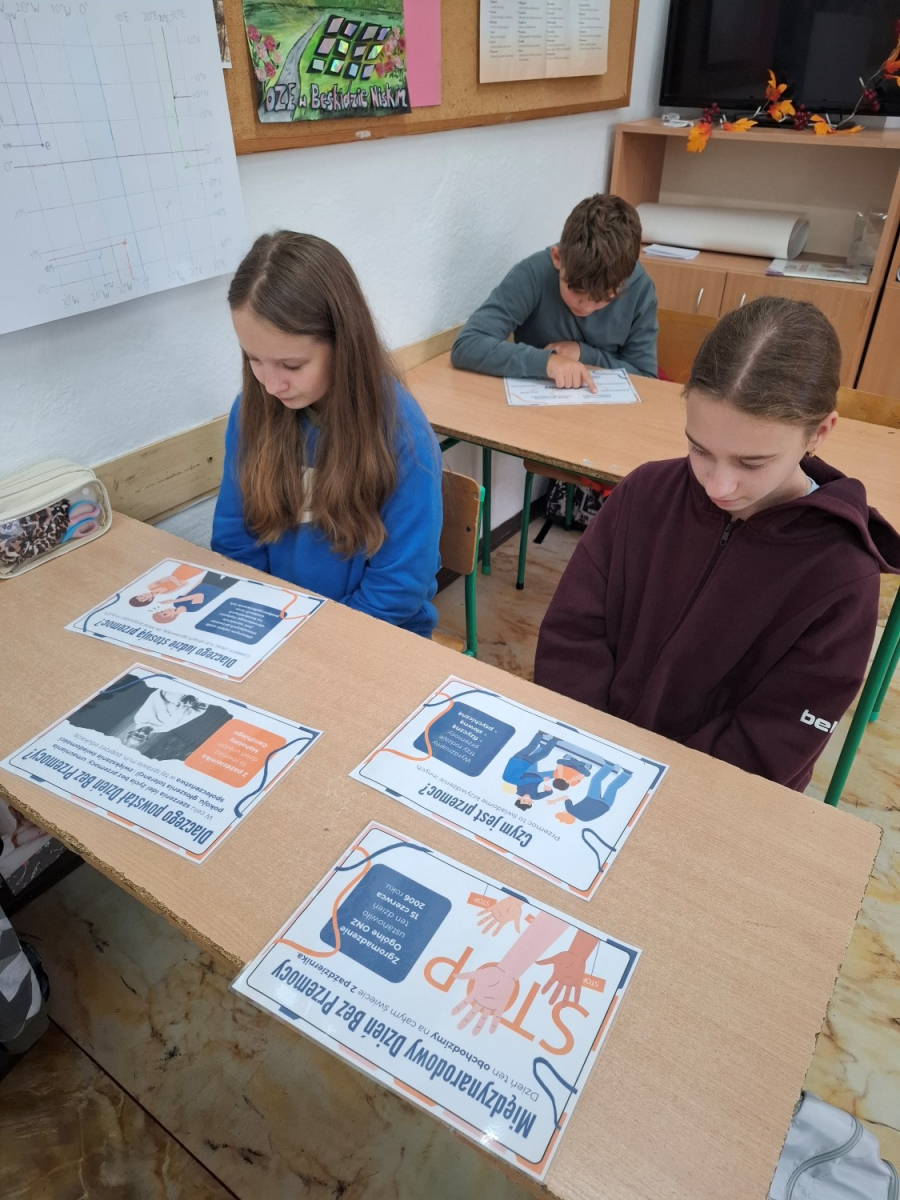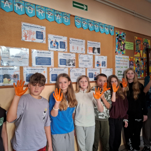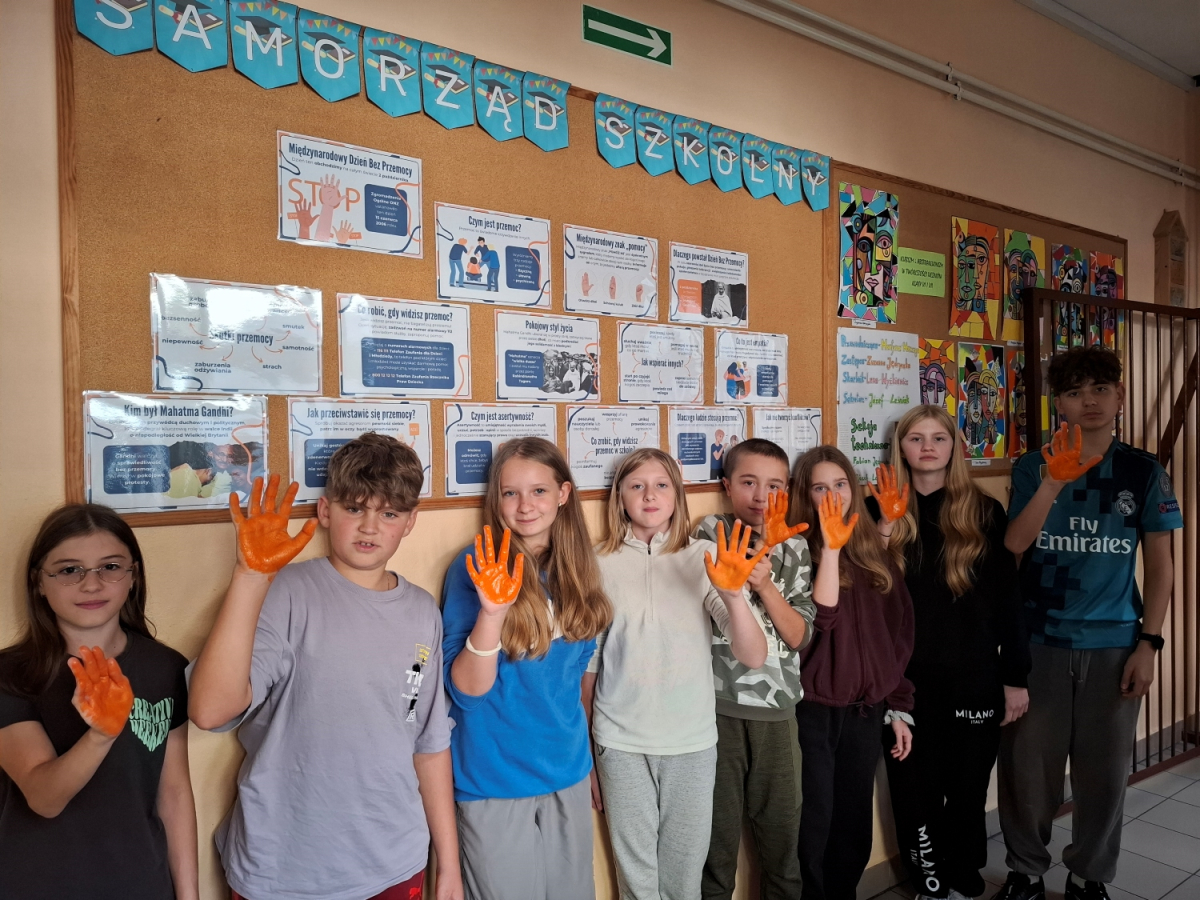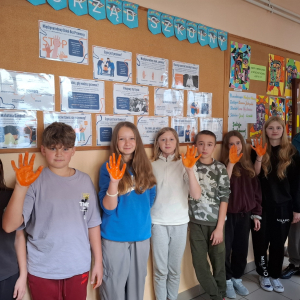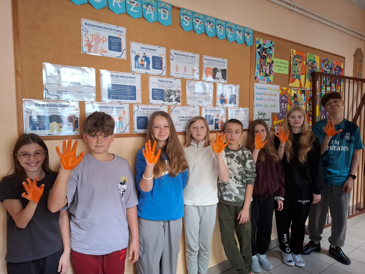 Uczniowie klas VI i VII uczestniczyli w godzinie wychowawczej poświęconej tematyce - cyberprzemocy. Dowiedzieli się, jak unikać i jak reagować, gdy ktoś staję się ofiarą hejtu lub nękania w sieci. Uczniowie uzupełniali karty pracy dotyczące cyberprzemocy, co pozwoliło im utrwalić wiedzę i zastanowić się nad własnym zachowaniem w sieci. Wszyscy z zainteresowaniem obejrzeli również przygotowaną gazetkę szkolną poświęconą tematyce Międzynarodowego Dnia Bez Przemocy. Na zakończenie uczniowie klas VI i VII symbolicznie pomalowali swoje dłonie na pomarańczowo, co jest wyrazem sprzeciwu wobec przemocy./J. Bartuś/