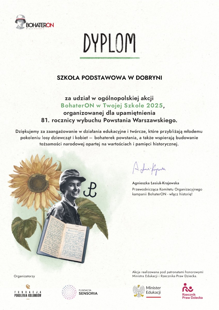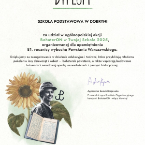 „BohaterON w Twojej Szkole” to część ogólnopolskiej kampanii o tematyce historycznej, mającej na celu upamiętnienie i uhonorowanie uczestników Powstania Warszawskiego oraz promocję historii Polski XX wieku. Na rok 2025 przypada 10. edycja kampanii edukacyjnej która, bazując na historiach Powstańców, ma za zadanie wzmacniać poczucie patriotyzmu i tożsamości narodowej. Tegoroczną edycję organizatorzy poświecili kobietom – uczestniczkom powstania, które stanowiły około 20 proc. wszystkich powstańców i odegrały niezwykle ważną rolę w jego przebiegu. W akcji "Bohateron w Twojej szkole" kolejny raz udział wzięli uczniowie klasy 7 i 8 Szkoły Podstawowej w Dobryni. Na lekcjach historii i zajęciach z wychowawcą obejrzeli specjalnie przygotowany odcinek serii „Co za historia" pt. „Kobiety w Powstaniu Warszawskim" i pracowali w oparciu o wiadomości z tego odcinka. Wspólnie przygotowali laurki i życzenia dla Powstańców, zaś uczniowie klasy 8 zamieścili wpisy z podziękowaniami na portalu www.dumnizpowstańców.pl. Każdy wpis to znacznik na mapie Polski symbolizujący dowód uznania, pamięci i dumy z Powstańców Warszawskich oraz młodych pamiętających i dumnych ze swojej historii./BB/