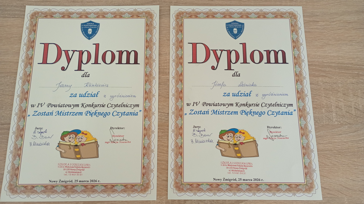 Świetne wiadomości napłynęły z Nowego Żmigrodu! Uczniowie klasy VIII naszej szkoły z powodzeniem zaprezentowali swoje umiejętności w IV Powiatowym Konkursie Czytelniczym „Zostań Mistrzem Pięknego Czytania”, który odbył się 25 marca 2026 roku. Konkurs skierowany był do uczniów klas IV–VIII szkół podstawowych i miał na celu rozwijanie umiejętności pięknego czytania na głos, popularyzowanie czytelnictwa oraz uwrażliwienie młodych ludzi na piękno literatury. Uczestnicy rywalizowali w dwóch kategoriach wiekowych, prezentując fragmenty wylosowanych utworów literackich. Jury oceniało m.in. płynność czytania, poprawność, dykcję oraz interpretację tekstu. Z dumą informujemy, że Joanna Klimkiewicz i Józef Leśniak zdobyli wyróżnienie w swojej kategorii wiekowej. To duże osiągnięcie, biorąc pod uwagę wysoki poziom konkursu oraz liczną konkurencję. Udział w wydarzeniu był nie tylko okazją do sprawdzenia swoich umiejętności, ale także do rozwijania pasji czytelniczych i wymiany doświadczeń z rówieśnikami. Serdecznie gratulujemy naszym uczniom oraz życzymy dalszych sukcesów i rozwijania zamiłowania do literatury./ŻP/